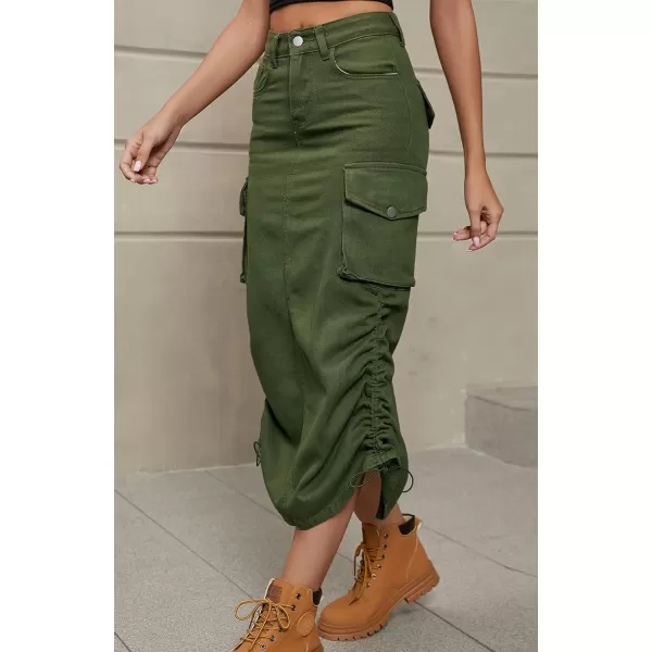 CHARTOU Women Long Denim Maxi Skirt Cargo Skirt Jean Skirt Y2K Casual Ruched A Line Pencil Skirt with Pocket(Armygreen)