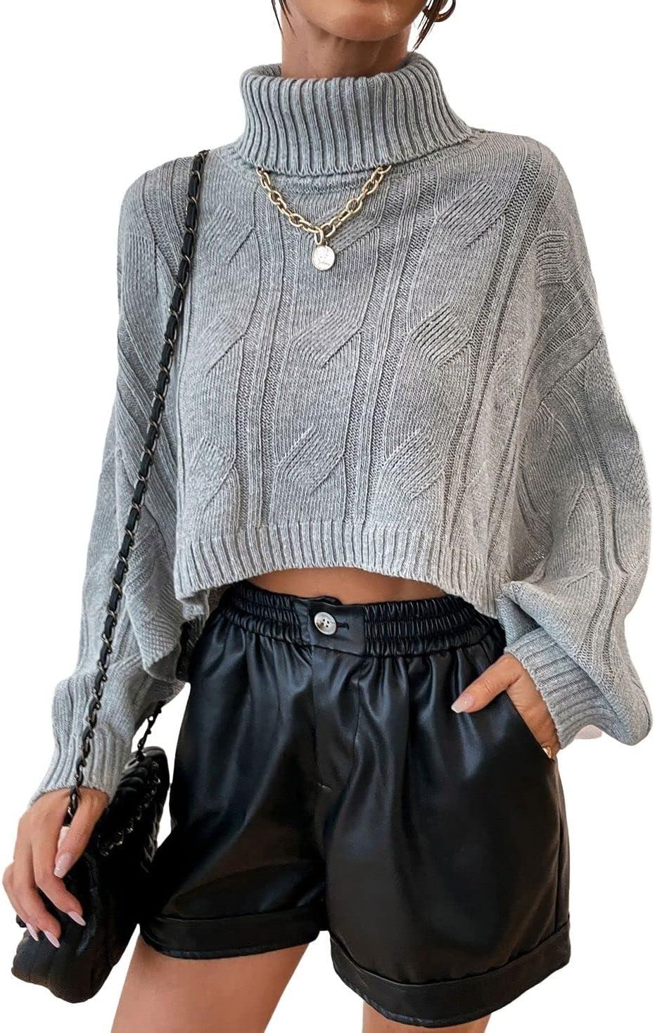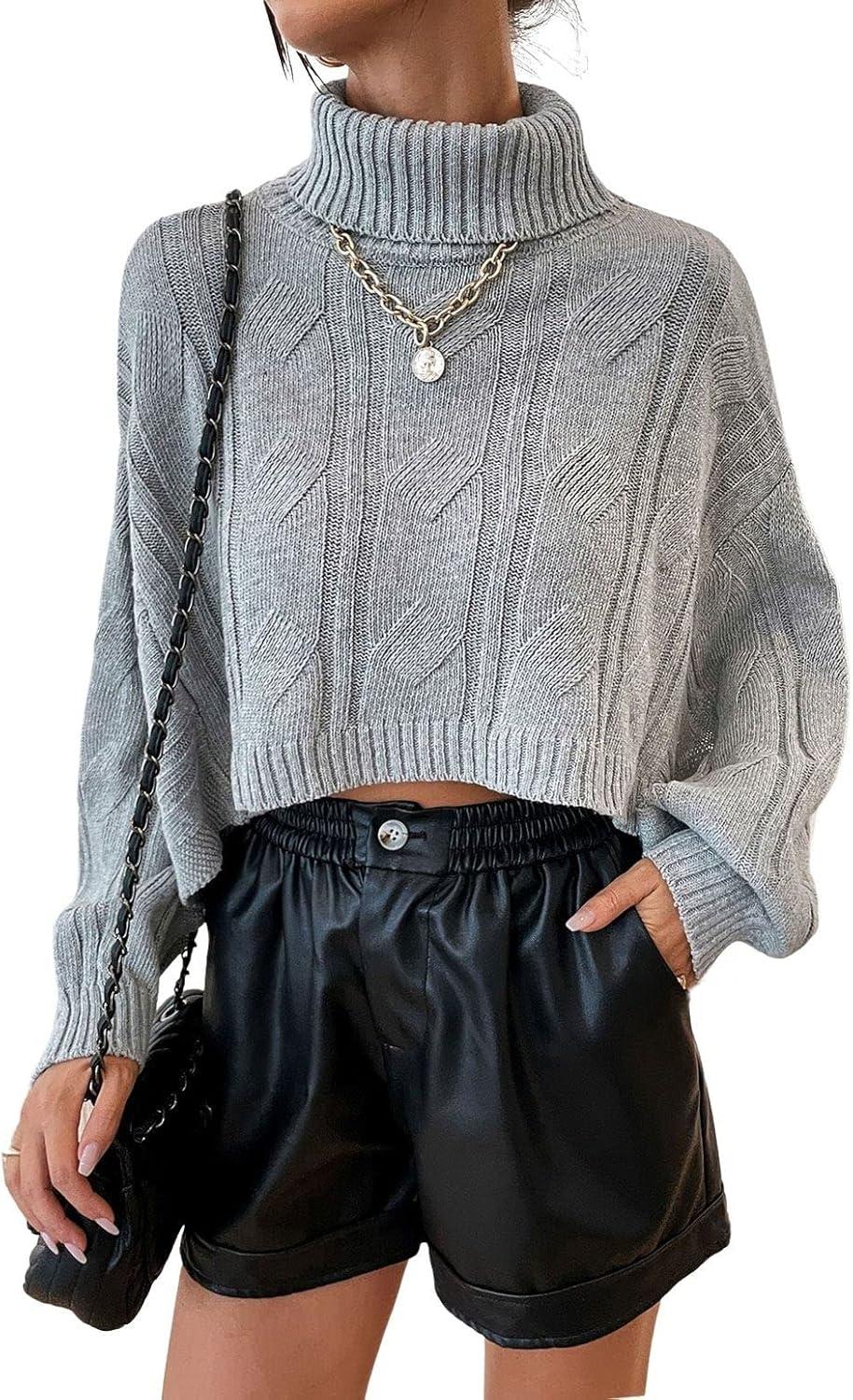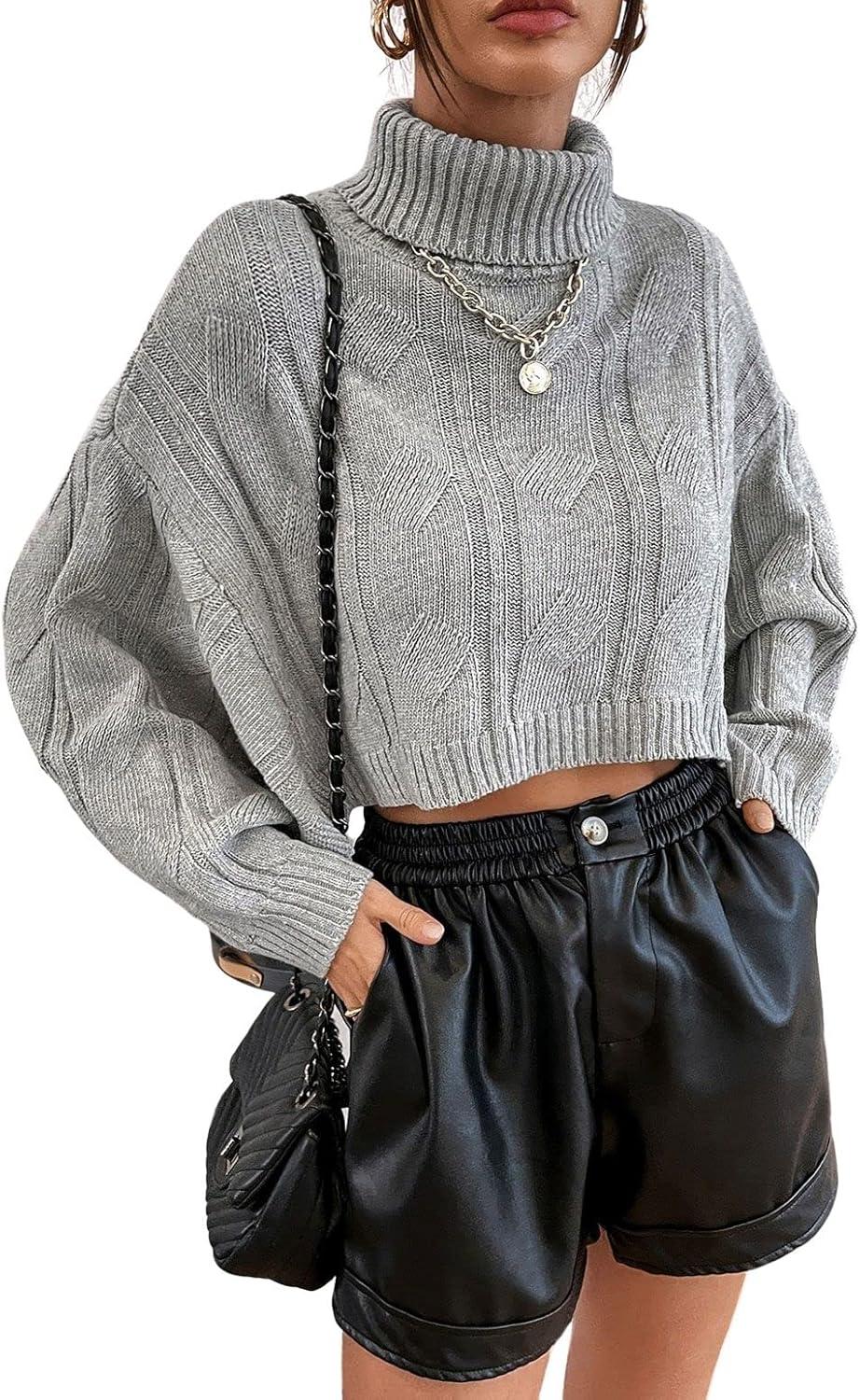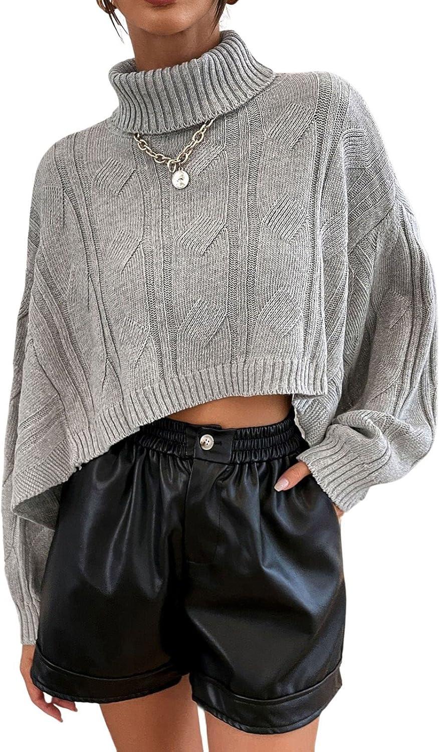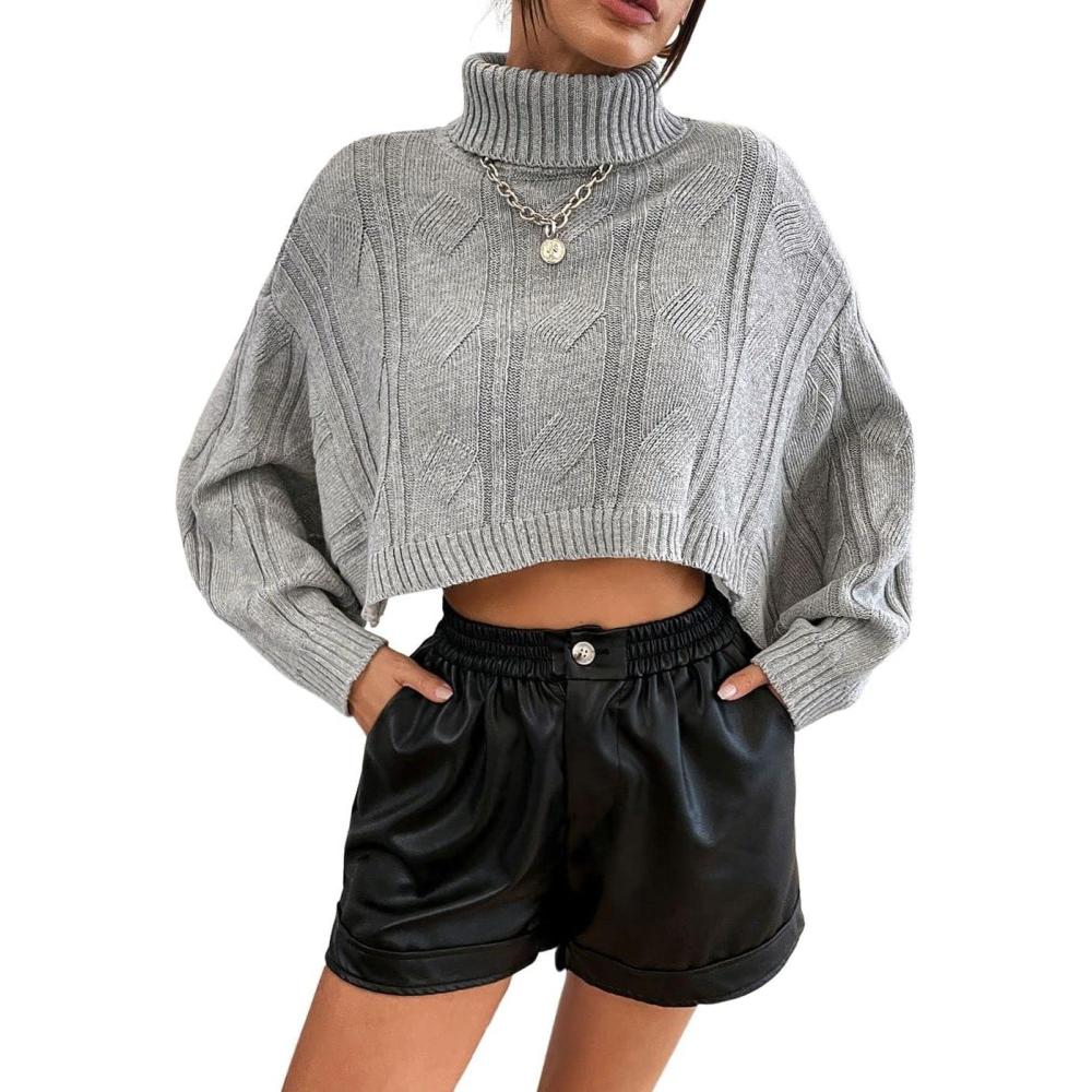 CHARTOU Women Long Sleeve Knitted Crop Turtleneck Sweater Cropped Knit Sweater Jumper Top Pullover(Grey)