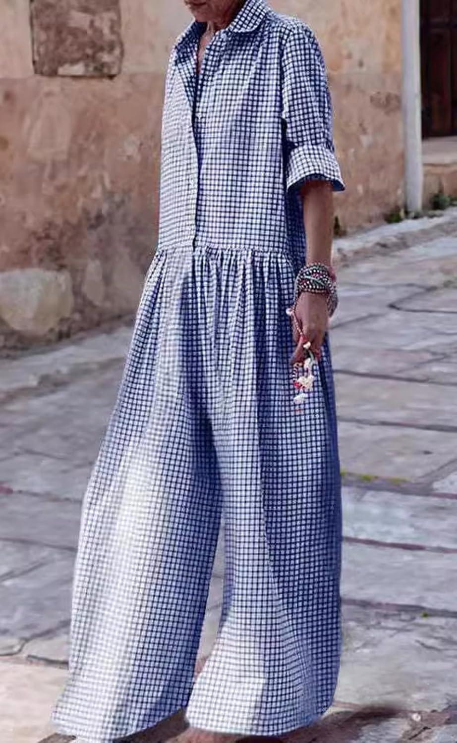 CHARTOU Women Long Sleeve Plaid Jumpsuit Casual Button Up Shirt Pleated Wide Leg Long Pants Overalls Romper Loose wide leg overalls jumpsuit for women/Flowy jumpsuit for women long sleeve/One piece pants suit【Size Guide】S=US 4-6, M=US 8-10, L=US 12-14, XL=US 16-18, XXL=US 20-22; Please must refer to the size chart on the left photo gallery before purchase【Highlights】Oversized plaid jumpsuit, classy gingham pattern, chic and trendy; Loose fit one piece long sleeve jumpsuit overalls, strike to a slouchy look; Pleated wide leg long pants jumpsuit, flowy palazzo pants with pleats details【Trendy Design】Button down shirt jumpsuit, long sleeve, wide leg jumpsuit flowy bottom palazzo pants, chic gingham plaid pattern, lightweight and comfortable material; Color-Black, Blue, Pink, and Yellow【Versatile Shirt Jumpsuit】Casual loose plaid jumpsuit long sleeve for women/button up collared pleated wide leg long pants overalls/drop crotch pants women/oversized jumpsuit for women/pleated jumpsuit for women/button up rompers for women/ extra long jumpsuit for tall women/ summer one piece jumpsuit beach outfits for women