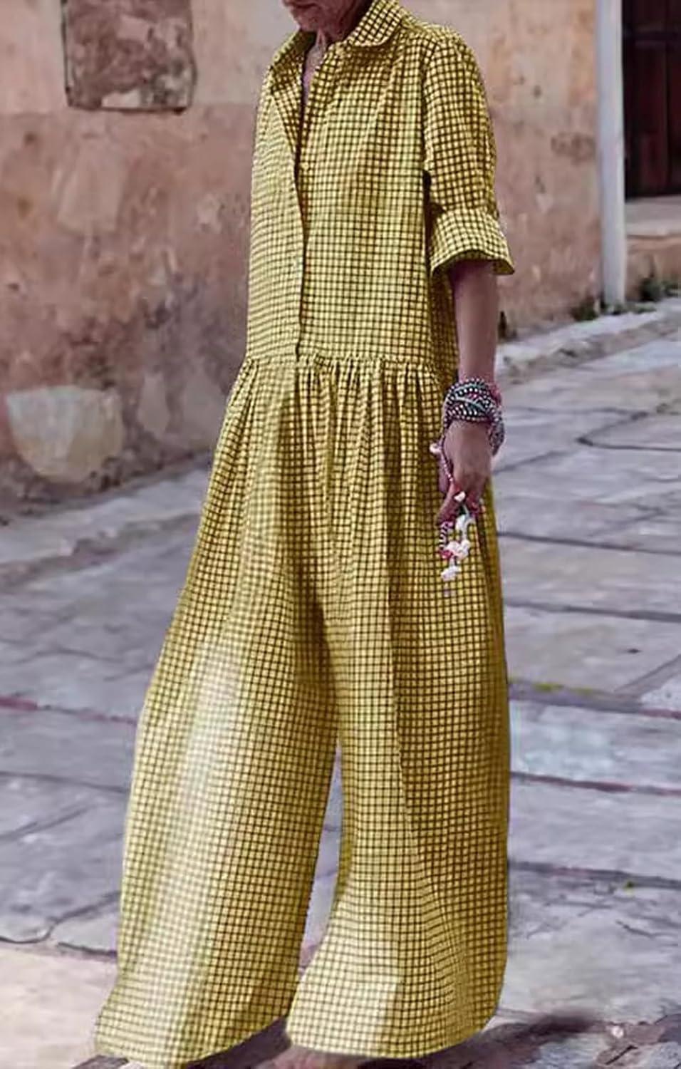 CHARTOU Women Long Sleeve Plaid Jumpsuit Casual Button Up Shirt Pleated Wide Leg Long Pants Overalls Romper(Yellow)
