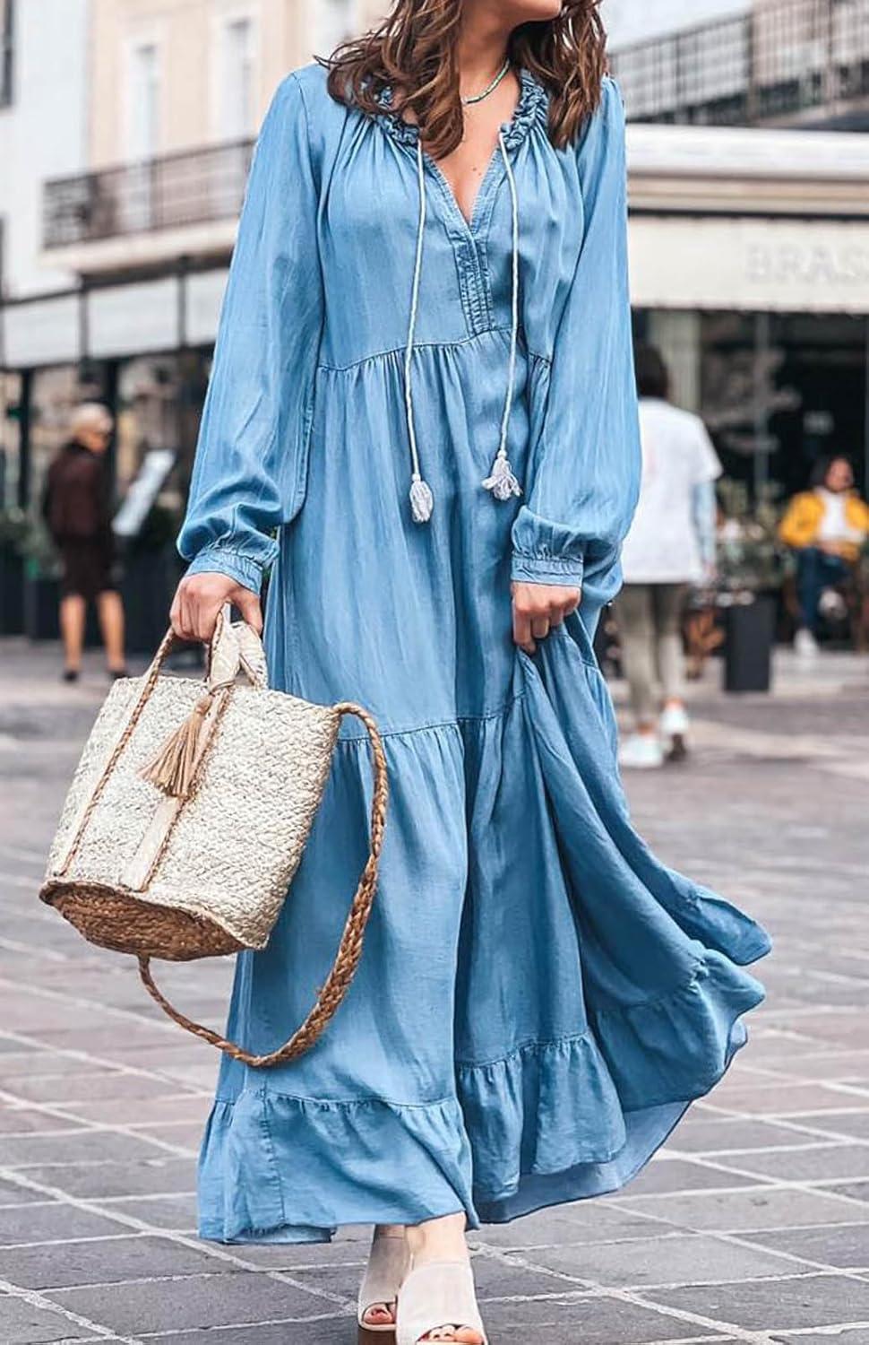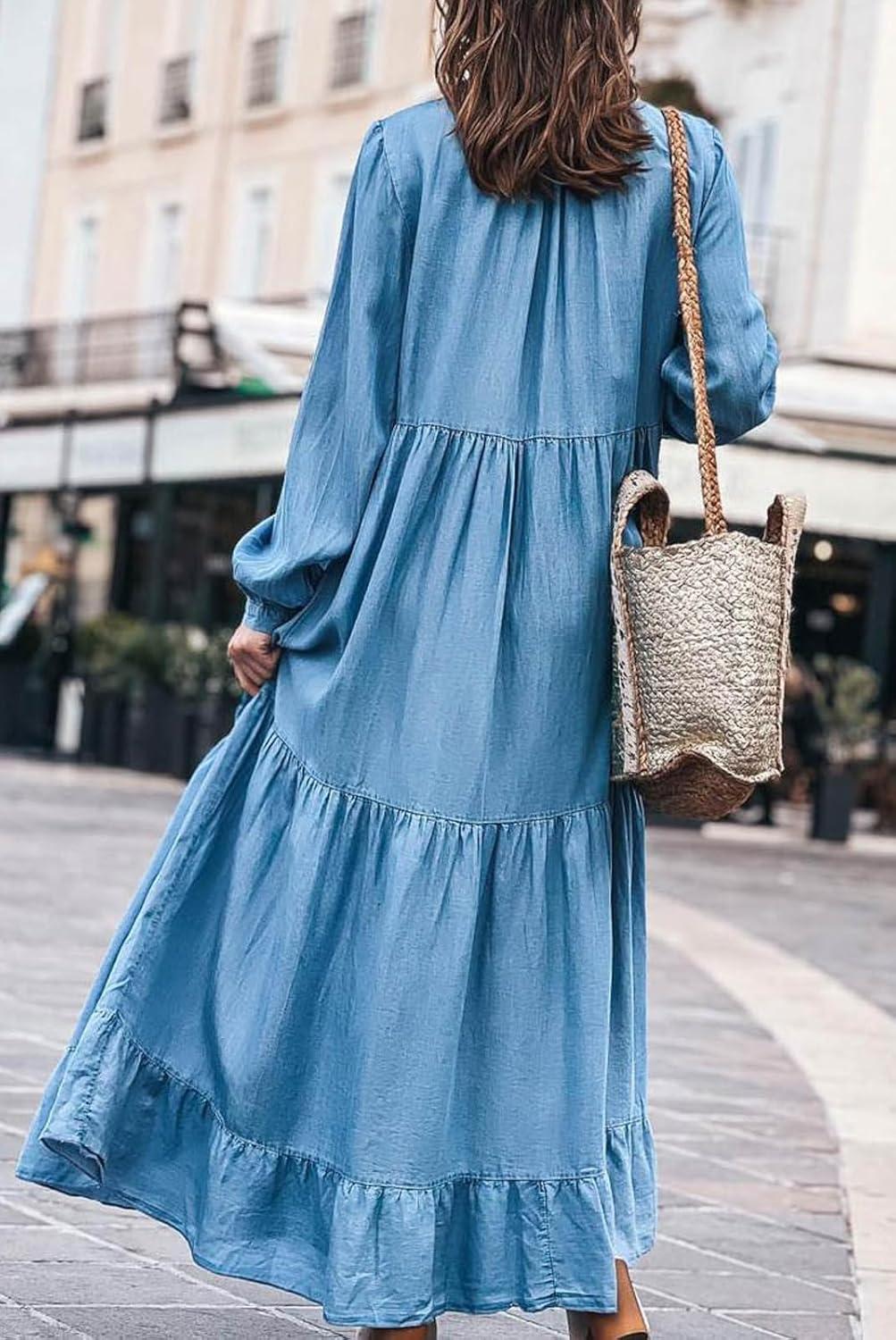 CHARTOU Women Long Tencel Denim Dress Maxi Flowy Dress Western Long Sleeve Lightweight A Line Swing Dress Lightweight tencel denim dress, more comfortable and breathable to wear as cute spring dress Flowy long dress/ Tiered maxi long dress/ Lightweight and thin fabric 【Size Guide for DENIM DRESS】—-XS=US 0-2, S=US 4-6, M=US 8-10, L=US 12-14, XL=US 16-18, XXL=US 20-22. Please refer to the body size chart in last picture before purchase. 【SELLING POINTS for SWING DRESS】—– Long sleeves/ Ruffle frill V neck with drawstring/ Ruffle pleated long dress/ Tiered layered maxi dress/ Solid color- blue jean dress for women 【VERSATILE LONG MAXI DRESS】—- Weekend long denim dress A line dress casual pleated ruffle dress long maxi dresses for women, daily wear boho maxi dress with sleeves, streetwear flowy dress cute spring dresses chambray, holiday vacation bohemian dress sundress tropical dresses chambray hippie dress overall, night club layered tiered dress flared dress, women long summer dresses babydoll dress for women western modest dresses for women