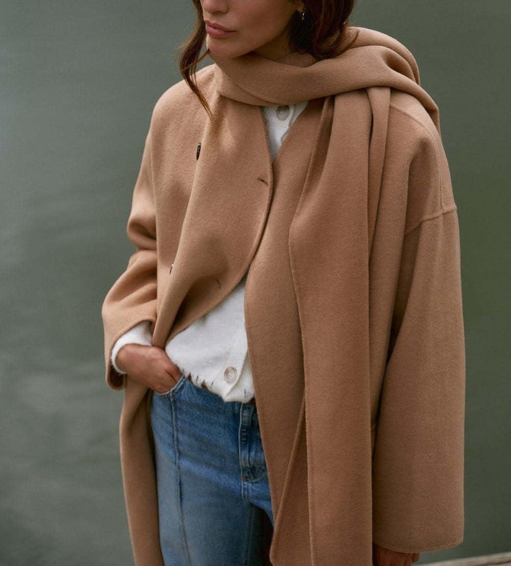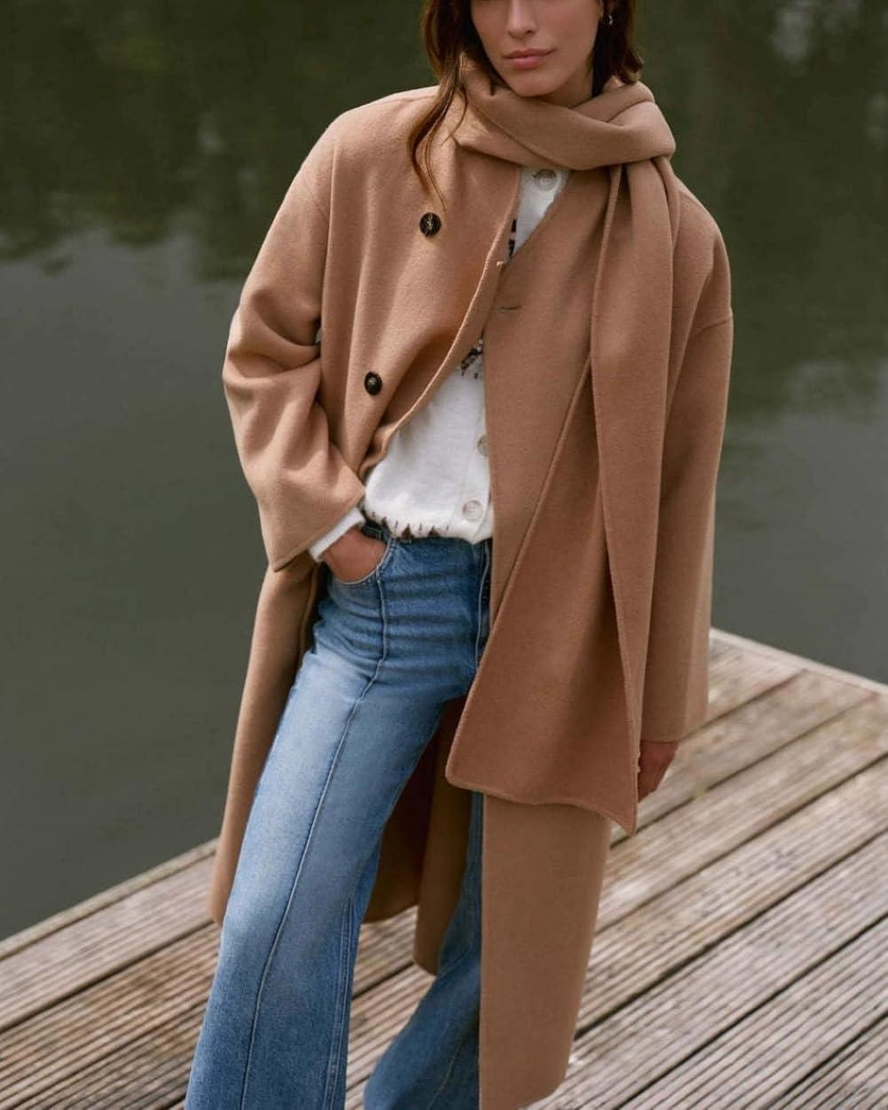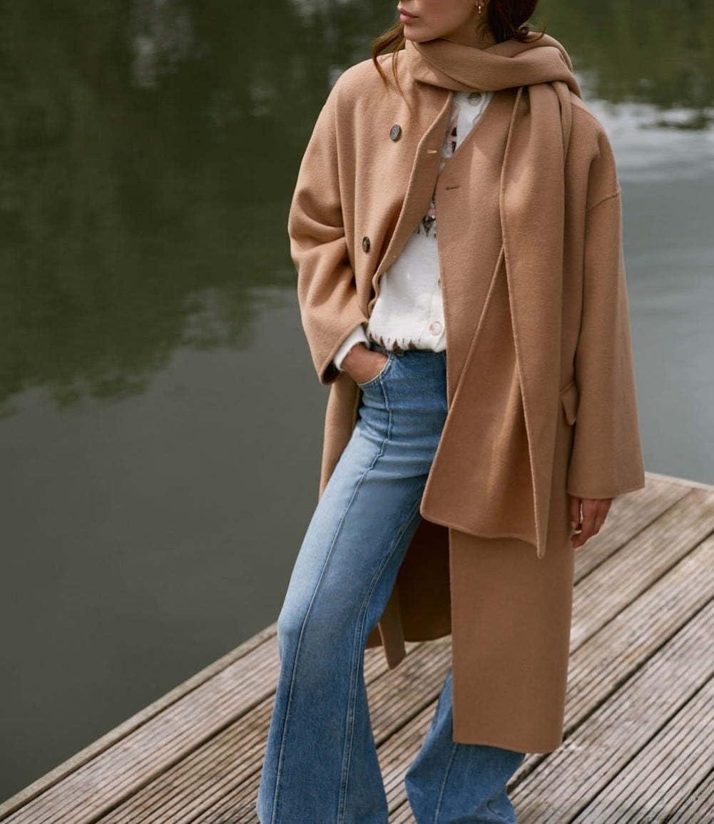 CHARTOU Women Long Wool Pea Coat Fall Winter Lapel Double Breasted Midi Trench Overcoat with Scarf(Khaki)