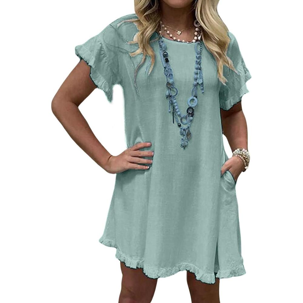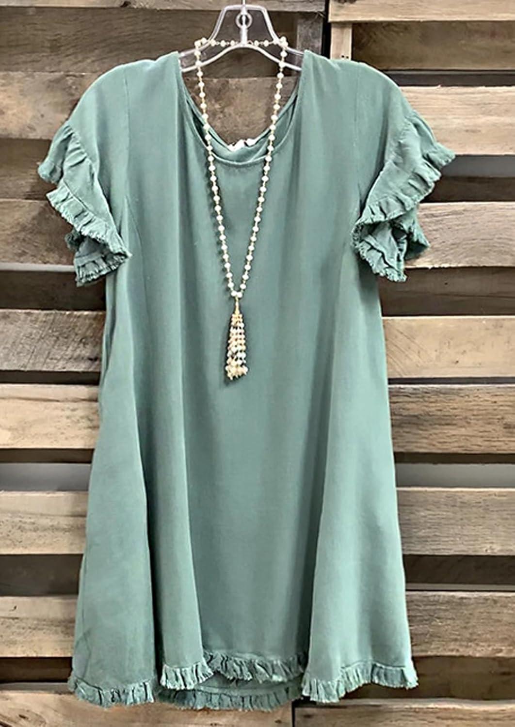 CHARTOU Women Loose Linen Mini Dress Summer Modest Frayed T Shirt Flowy Ruffle Short Sleeve Shift Dress Pocket(Green)