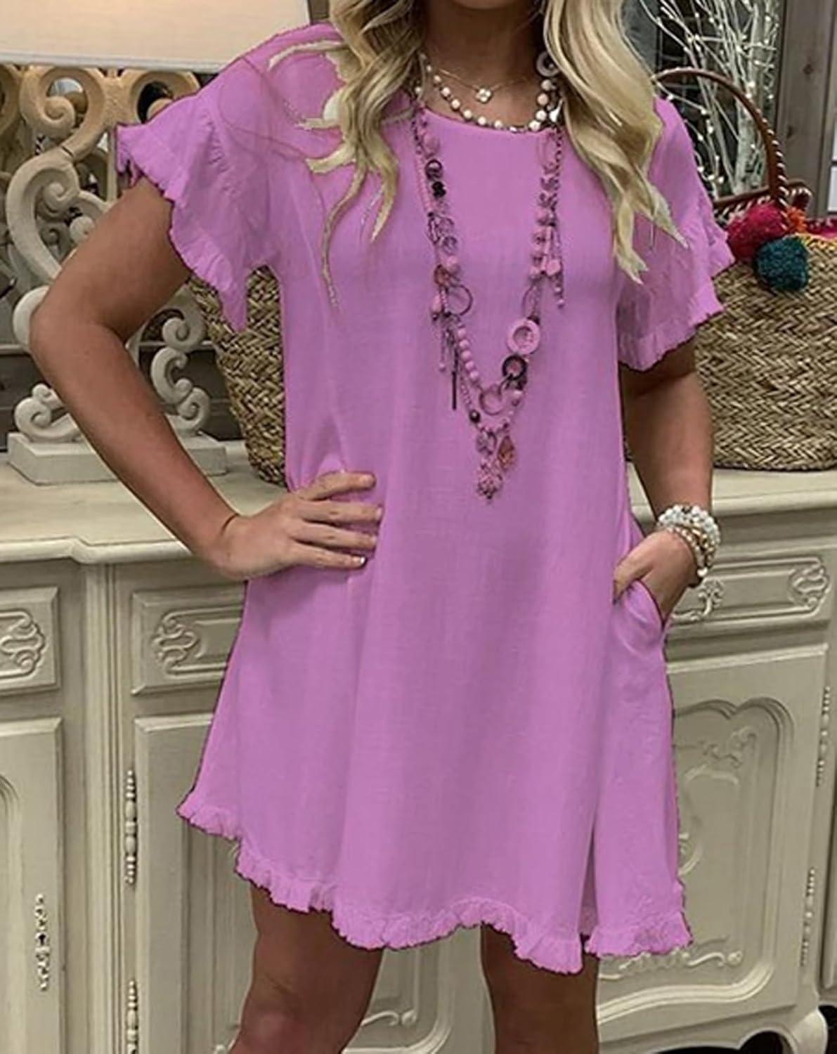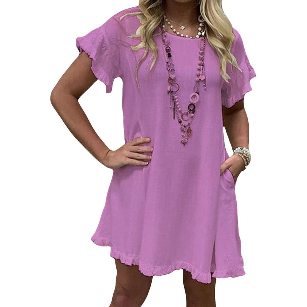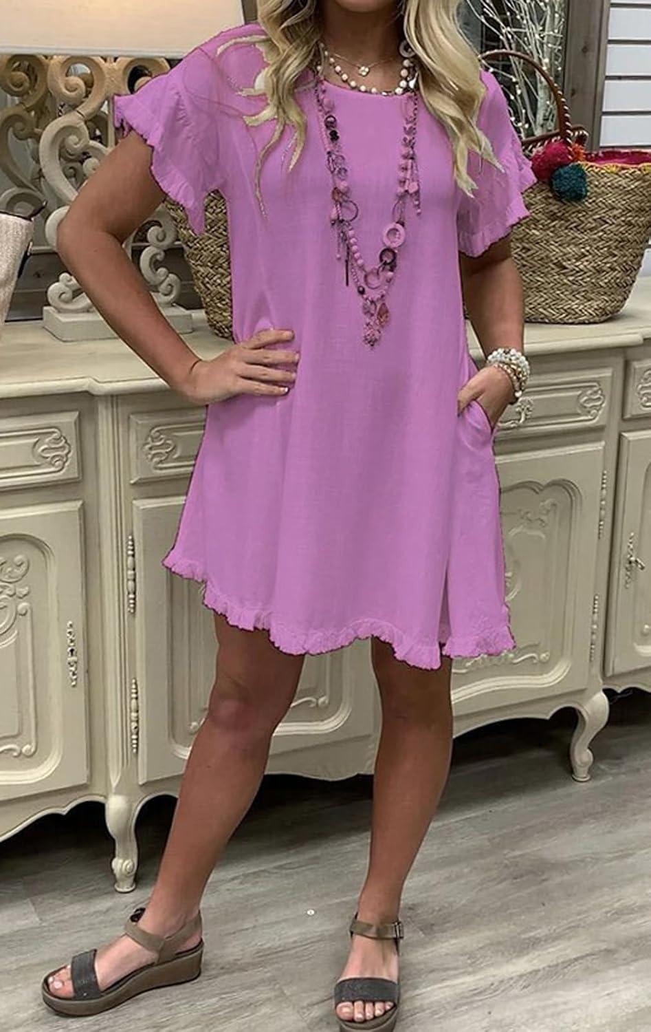 CHARTOU Women Loose Linen Mini Dress Summer Modest Frayed T Shirt Flowy Ruffle Short Sleeve Shift Dress Pocket(Purple)