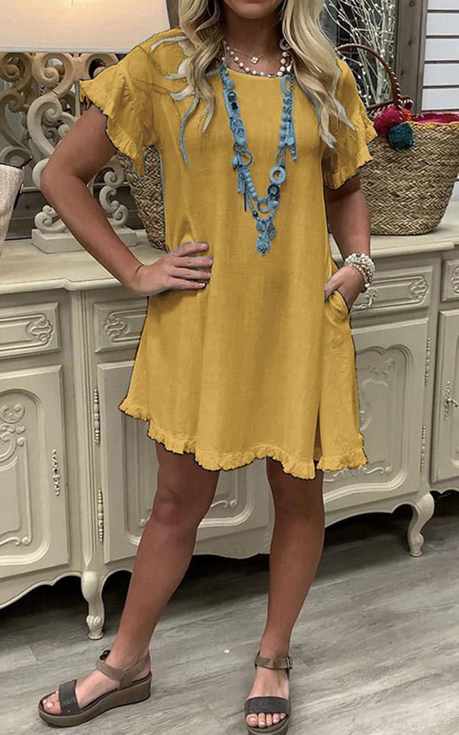 CHARTOU Women Loose Linen Mini Dress Summer Modest Frayed T Shirt Flowy Ruffle Short Sleeve Shift Dress Pocket(Yellow)