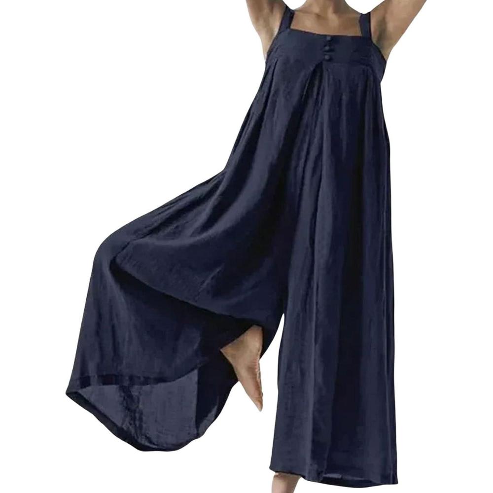 CHARTOU Women Loose Linen Wide Leg Jumpsuit One Piece Spaghetti Strap Palazzo Pants Long Romper Elastic Beach(Dark Blue)