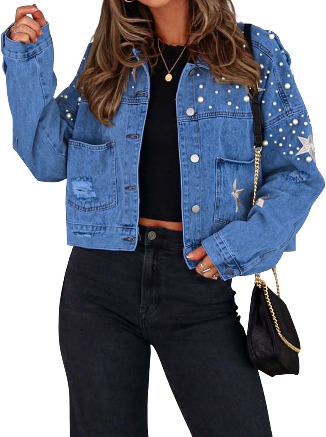 Get up to 60% off on CHARTOU Women Oversized Beading Pearl Jean Jacket Embroidered Star Distressed Beaded Denim Jacket Coat styles during our winter sale event.