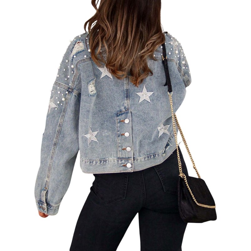 CHARTOU Women Oversized Beading Pearl Jean Jacket Embroidered Star Distressed Beaded Denim Jacket Coat(Light Blue)
