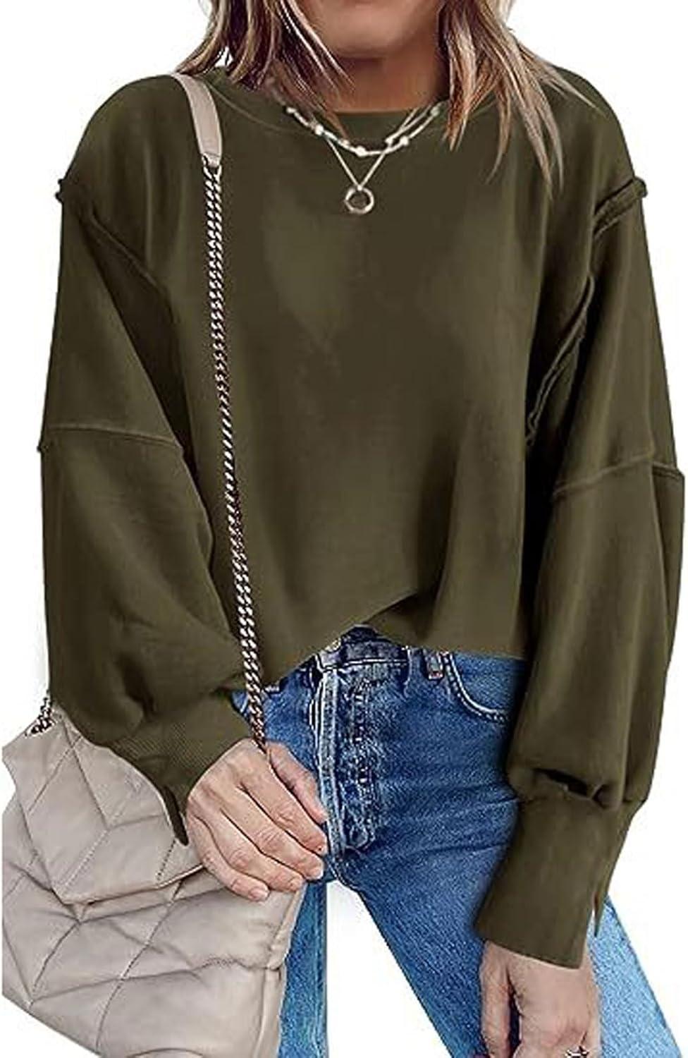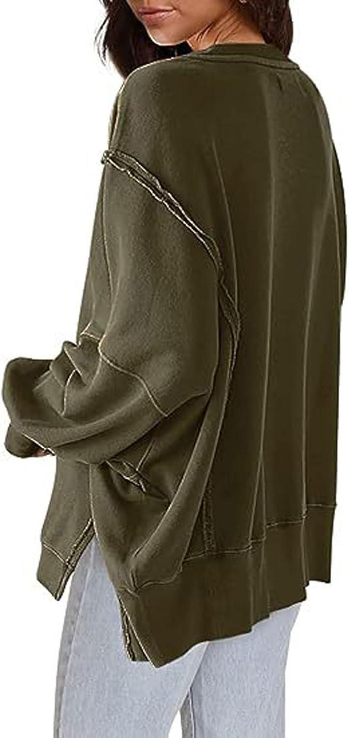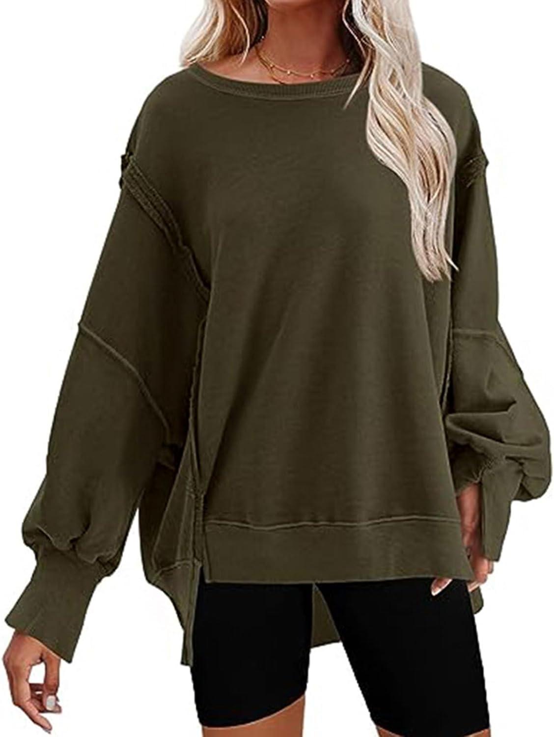 CHARTOU Women Oversized Crewneck Sweatshirt Ripped Distressed Hoodie Lightweight Tunic Shirts Sweatshirt(Armygreen)