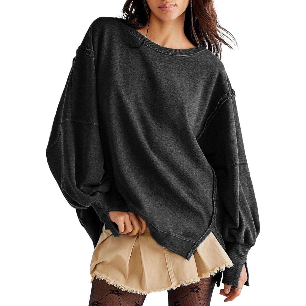 CHARTOU Women Oversized Crewneck Sweatshirt Ripped Distressed Hoodie Lightweight Tunic Shirts Sweatshirt(Black)