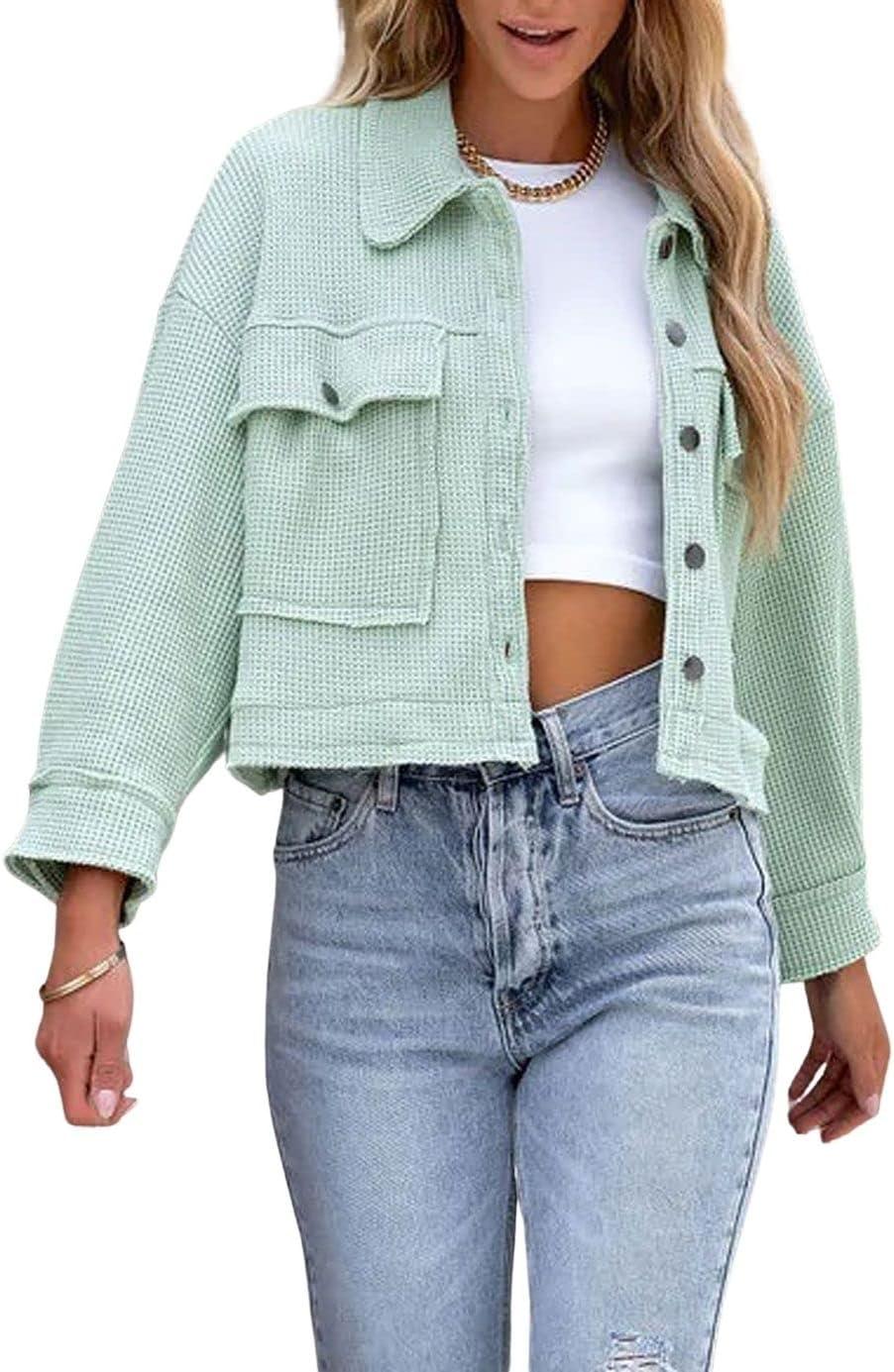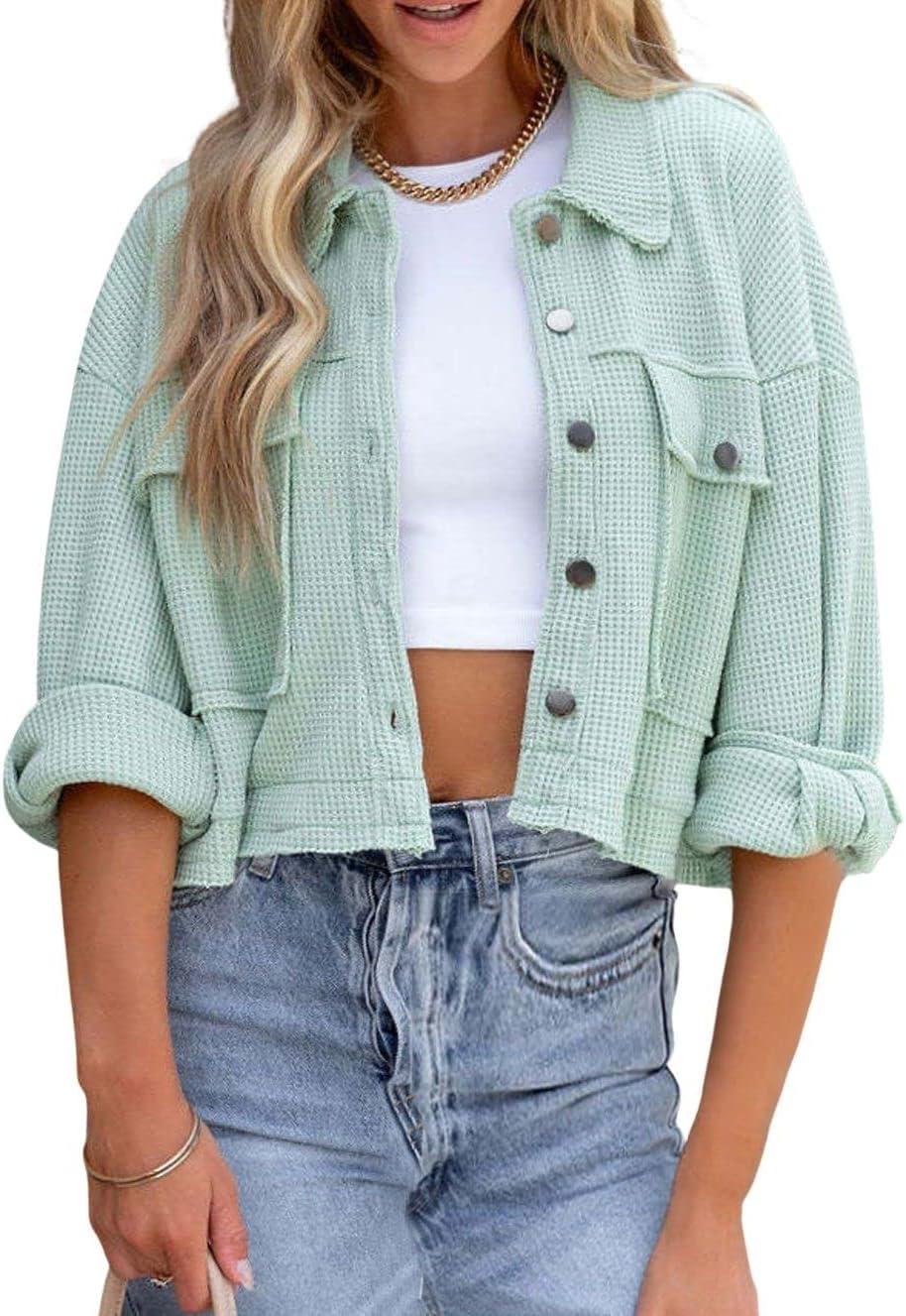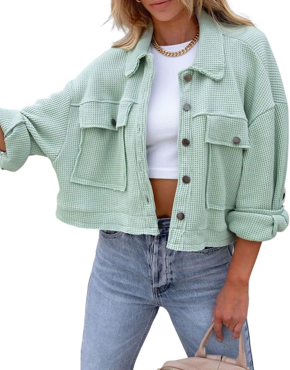 CHARTOU Women Oversized Cropped Waffle Knit Shacket Jacket Fall Patchwork Shacket Button Down Shirt(Green)