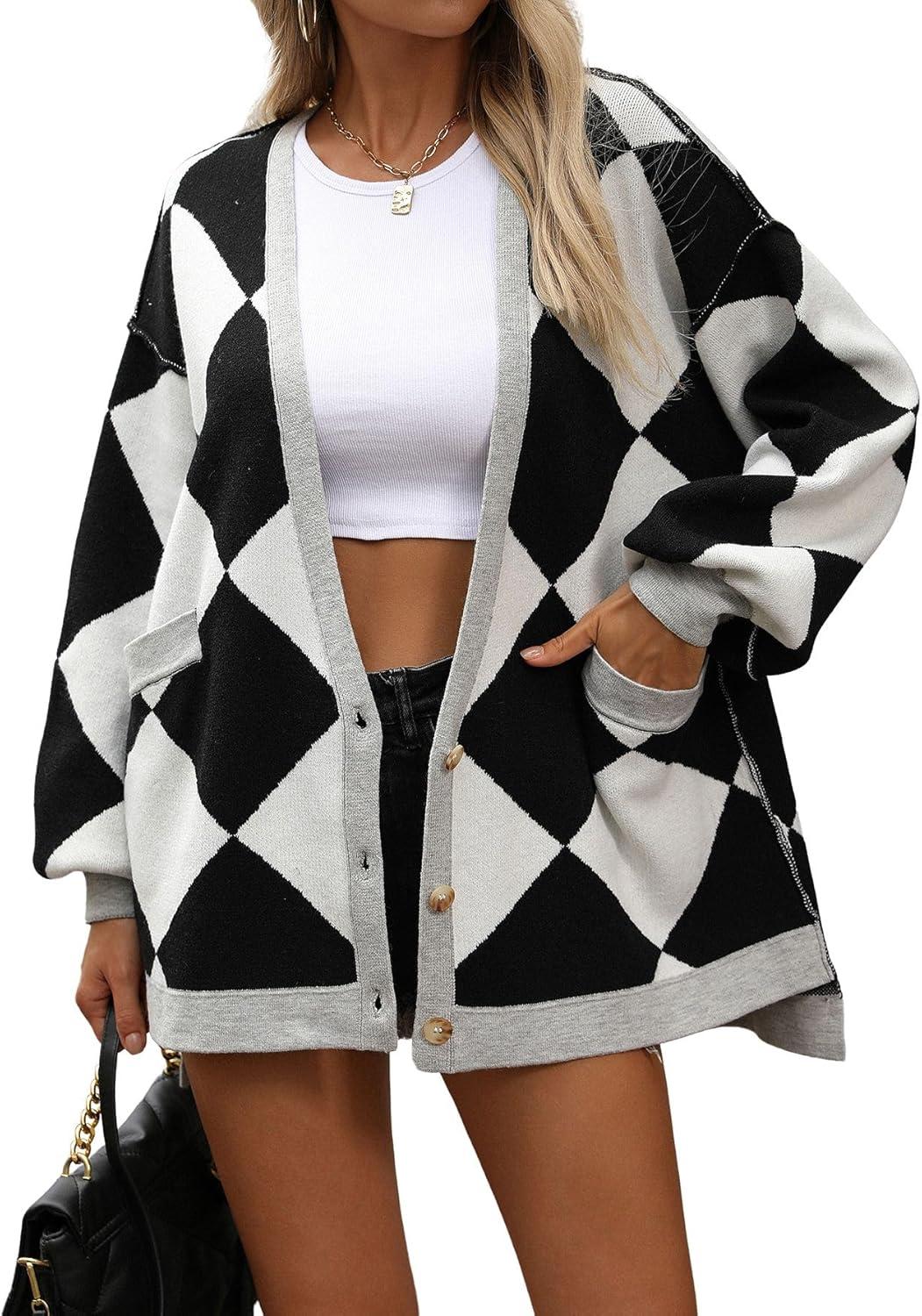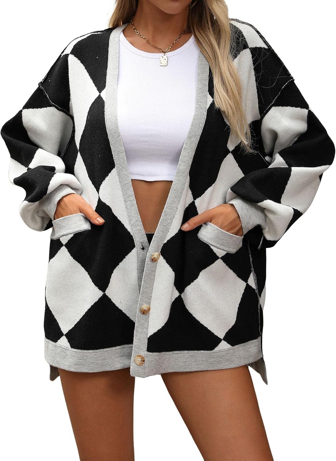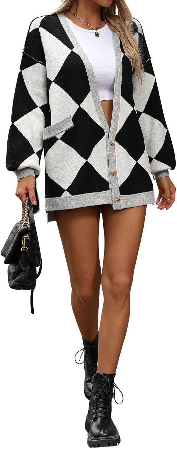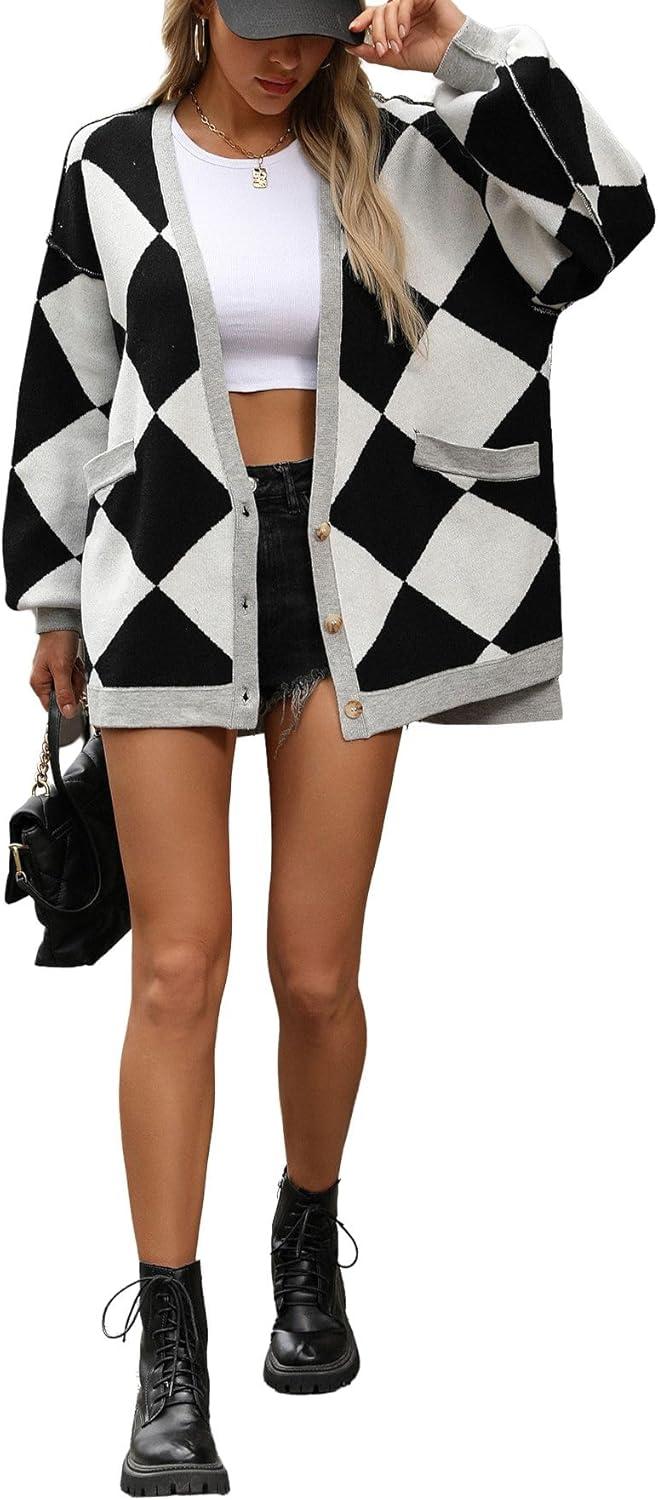 CHARTOU Women Oversized Sweater Diamond Checker Open Front Cardigan Loose Knitted Tops Slouchy fit cardigan sweater/ Preppy style diamond cardigan jacket/ Button down v neck oversized knitwear outwear【Highlights】Loose fit cardigan sweater. Shapeless and relaxed for an effortlessly live-in fit; Preppy style diamond print knit tops, perfect for your causal layering jacket; Color block trim design for eye-catching【Trendy Design】This checkered open front cardigan is crafted button down deep v neck, drop shoulder, 3 front buttons, lantern long sleeve, contrast trim, placket, and cuffs, casual loose fit cardigan sweater, 2 hand pockets convenient for essential carrying【Versatile】Women cardigan sweater fall outfits/ oversized long sleeve cardigan tops/ button down deep v neck baggy knitted sweater tops/ slouchy fit diamond preppy cardigan sweater/ long sleeve plaid knit cardigan tops/ women causal loose fit knit sweatshirt cardigan/ black and white cardigan sweater/ purple lightweight collarless cardigan tops/ navy open front cardigan jacket/ blue baggy loose fit midi length cardigan blazer【Size】S=US 4-6, M=US 8-10, L=US 12-14, XL=US 16-18; This oversized diamond open front cardigan sweater is made of high-quality fabric, lightweight and comfortable to wear; Perfect for your causal wear, going out, travelling, school, also lounge wear, and vacation travelling etc