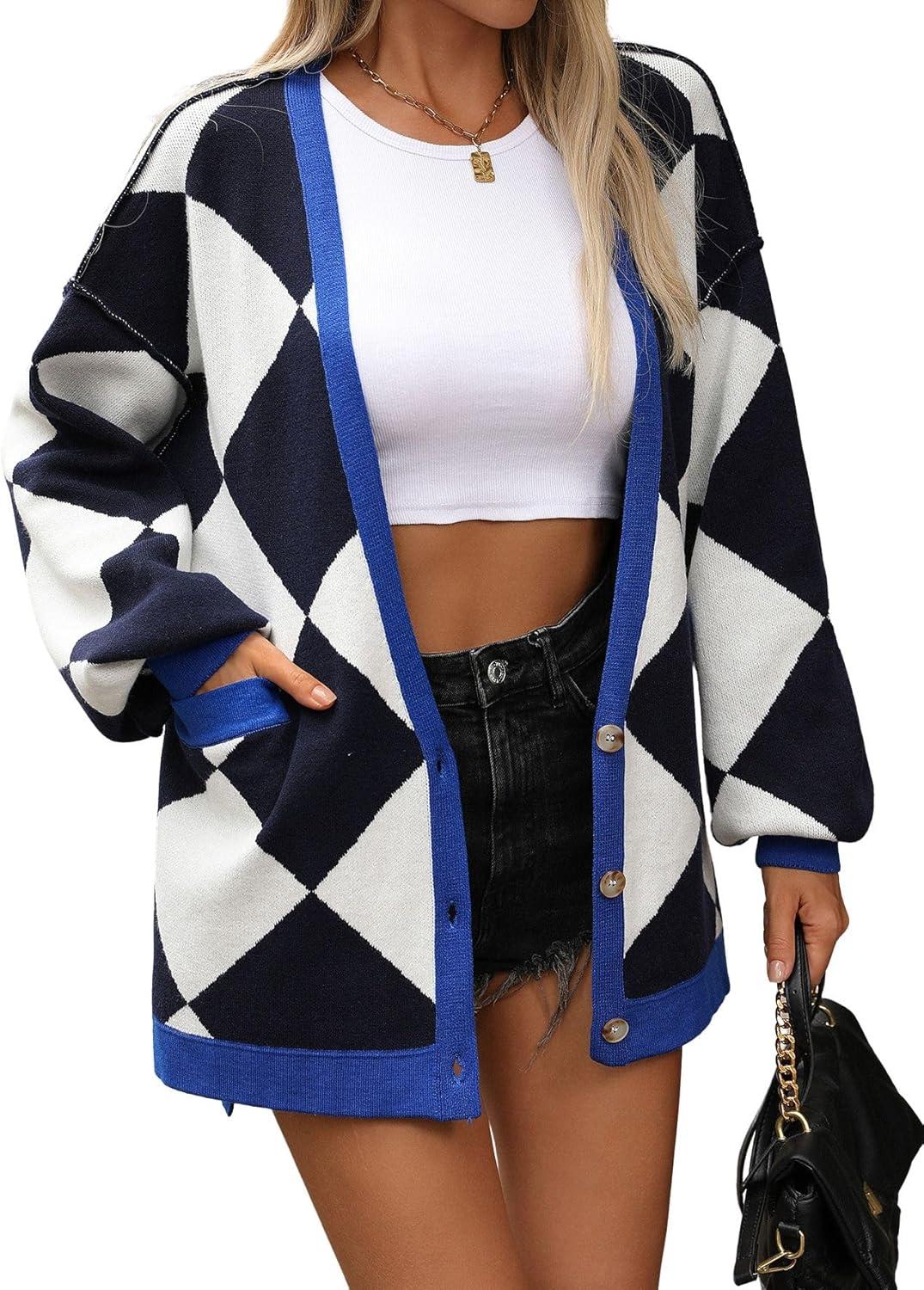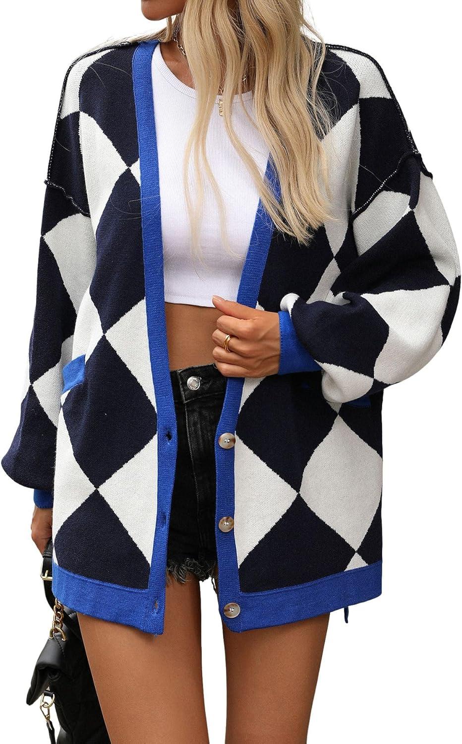 CHARTOU Women Oversized Sweater Diamond Checker Open Front Cardigan Loose Knitted Tops Slouchy fit cardigan sweater/ Preppy style diamond cardigan jacket/ Button down v neck oversized knitwear outwear【Highlights】Loose fit cardigan sweater. Shapeless and relaxed for an effortlessly live-in fit; Preppy style diamond print knit tops, perfect for your causal layering jacket; Color block trim design for eye-catching【Trendy Design】This checkered open front cardigan is crafted button down deep v neck, drop shoulder, 3 front buttons, lantern long sleeve, contrast trim, placket, and cuffs, casual loose fit cardigan sweater, 2 hand pockets convenient for essential carrying【Versatile】Women cardigan sweater fall outfits/ oversized long sleeve cardigan tops/ button down deep v neck baggy knitted sweater tops/ slouchy fit diamond preppy cardigan sweater/ long sleeve plaid knit cardigan tops/ women causal loose fit knit sweatshirt cardigan/ black and white cardigan sweater/ purple lightweight collarless cardigan tops/ navy open front cardigan jacket/ blue baggy loose fit midi length cardigan blazer【Size】S=US 4-6, M=US 8-10, L=US 12-14, XL=US 16-18; This oversized diamond open front cardigan sweater is made of high-quality fabric, lightweight and comfortable to wear; Perfect for your causal wear, going out, travelling, school, also lounge wear, and vacation travelling etc