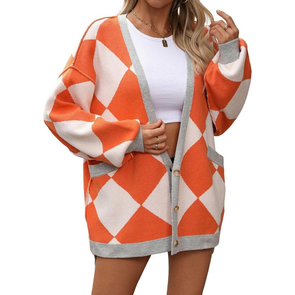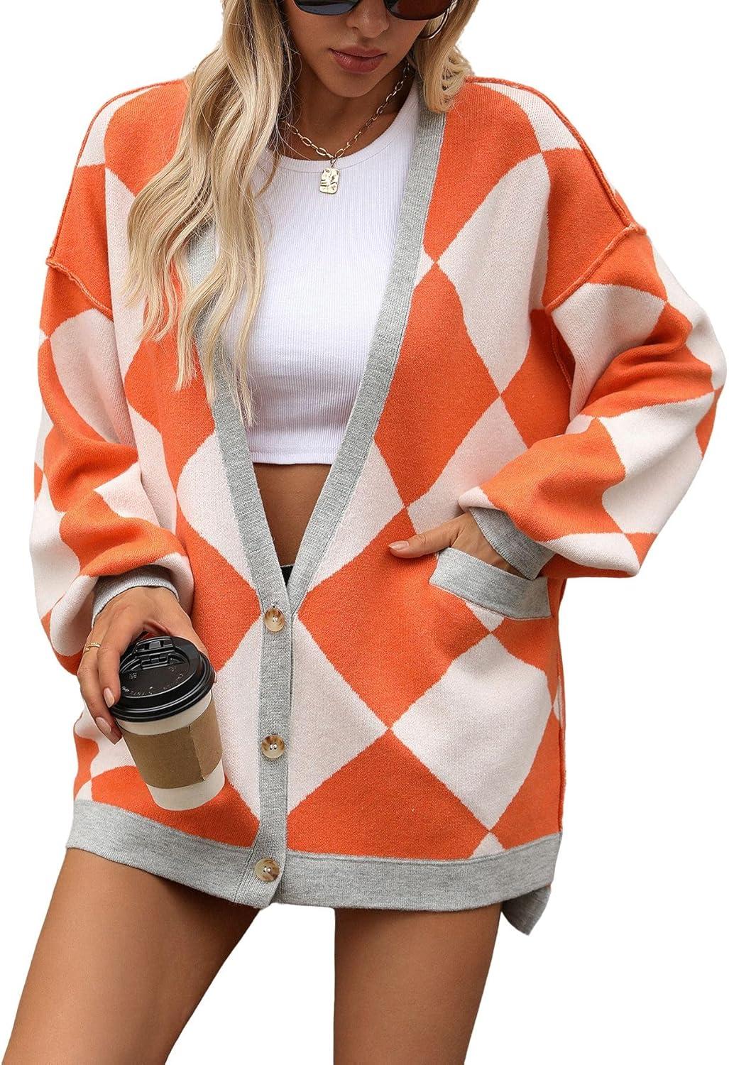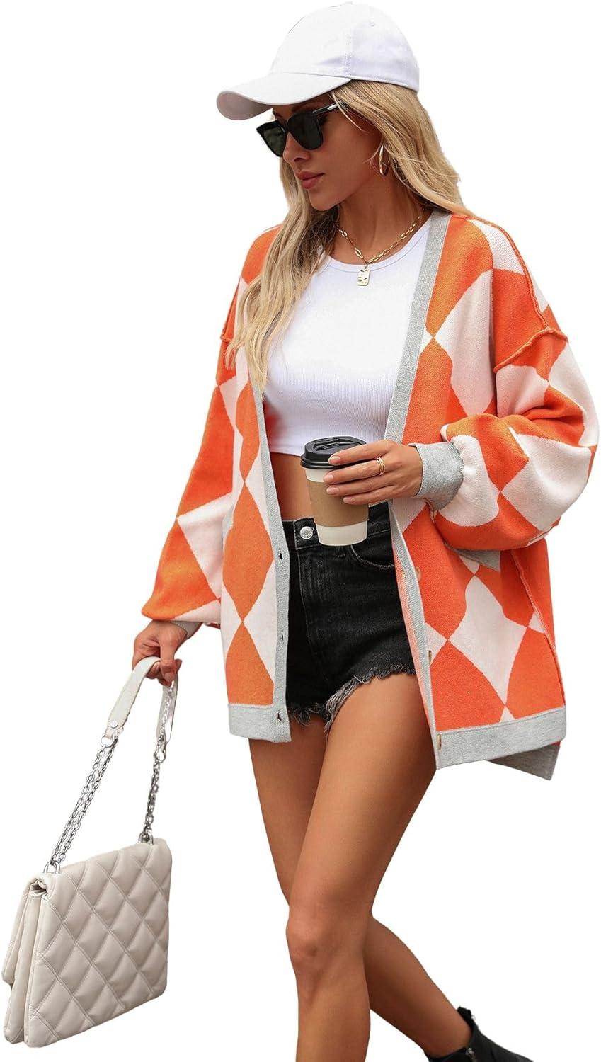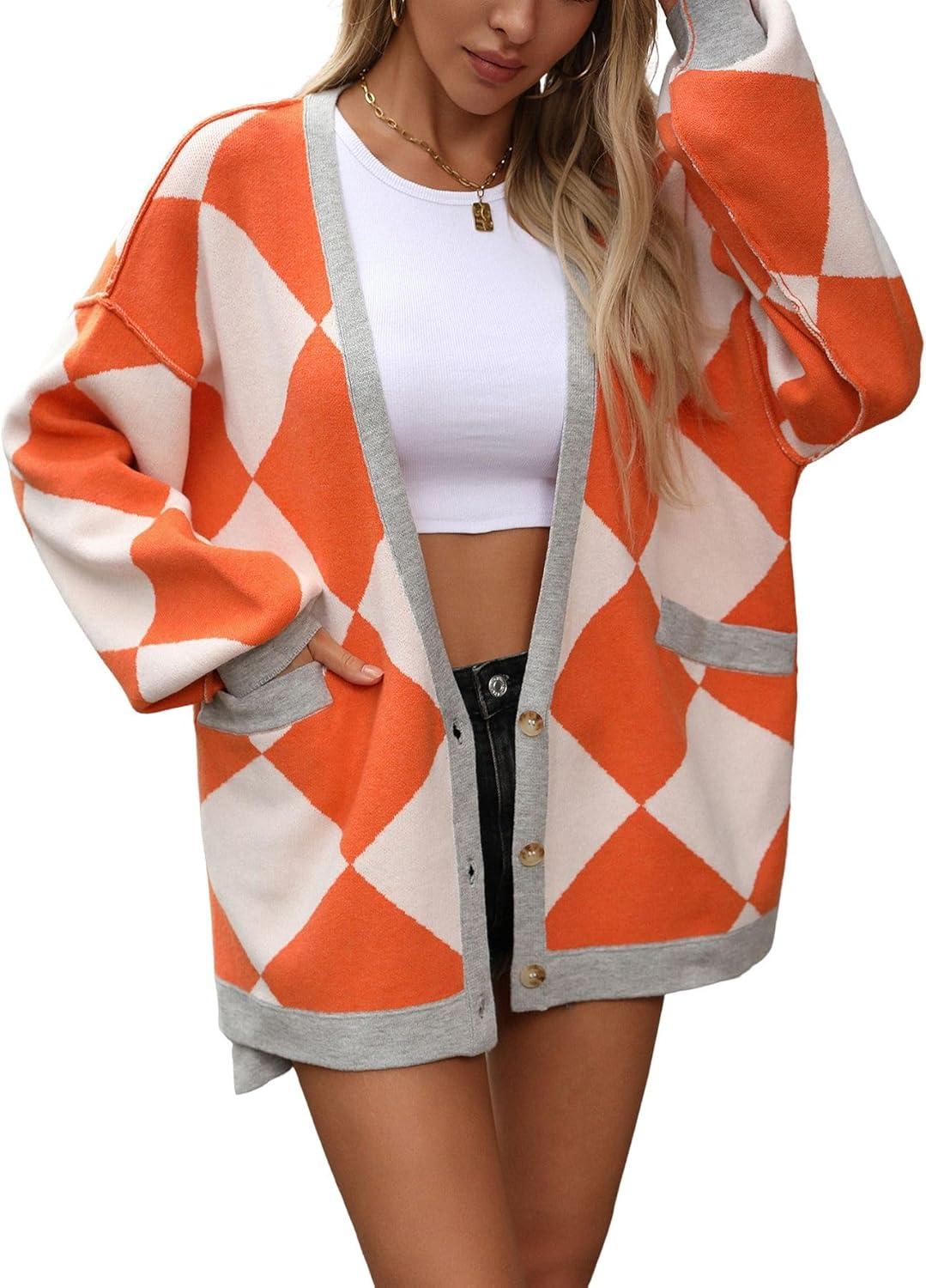 CHARTOU Women Oversized Sweater Diamond Checker Open Front Cardigan Loose Knitted Tops(Orange)