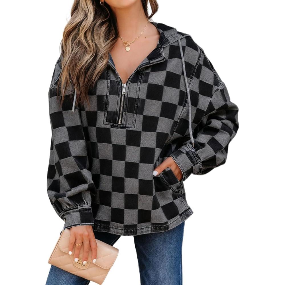 Women Plaid Denim Hoodies Pullover Oversized Jean Jacket Checker Half Zip Shirt Tops with Drawstring Hooded oversized sweatshirt for women trendy/ Boyfriend gingham jean hoodies with pockets Patchwork Hoodie Women Plaid Denim Jacket Half zip pullover women western denim shirt jacket womens denim jacket hoodie Casual Jean Top patchwork jean oversized sweatshirt for women 2025 blue jean hoodies cowgirl outfits Woman Denim Sweatshirt women checkered denim hoodie half zip oversized pullover tops cute plaid oversized jean jacket casual loose hooded blouse contrast gingham denim jacket for women trendy black patchwork sweatshirt boyfriend jean shirt streetwear western hoodie pockets