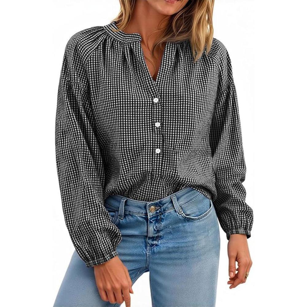 Soft Cotton Fabric: Made from all-cotton fabric, this plaid shirt feels lightweight and gentle on skin, offering breathable wear for all-day comfort, suitable for all body types/ Lantern Sleeves: Trendy lantern sleeves with pleated and relaxed oversized fit create a modern, flattering style that balances femininity with effortless casual charm/ Plaid Print Blouse: Classic gingham give this shirt a fresh, and casual style. This plaid blouse adapts to your look, it adds a touch of effortless elegance to any outfits. Ideal for spring, summer, and early fall. Wear easily with jeans, trousers, or skirts for endless outfits possibilities. Wear it under a coat in winter to create rich layers/ Mock Neck Button Detail: Elevated with a smart stand collar and front half button pullover shirt design, this shirt adds a polished touch to casual outfits while maintaining a laid-back vibe. This plaid pullover blouse can be used as a simple shirt for both workday or weekends, loose fit for most body types