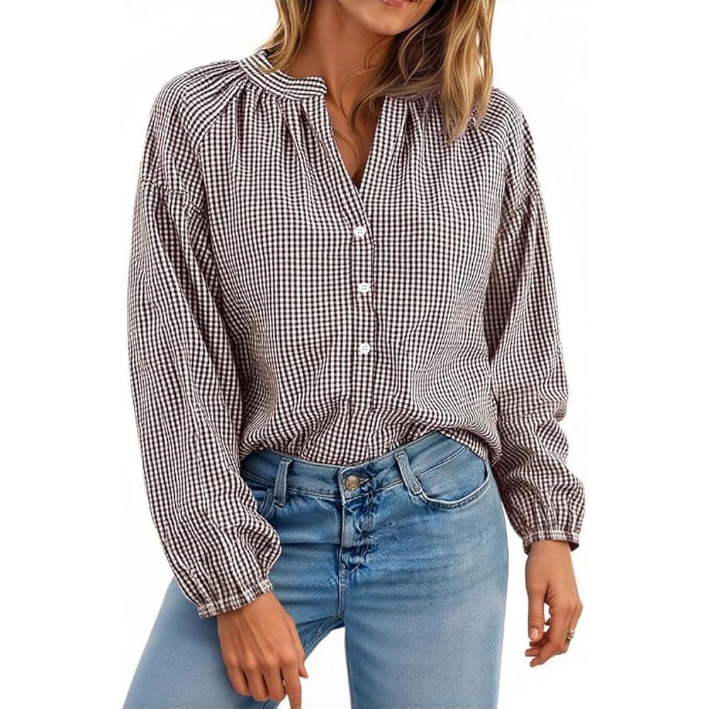 Soft Cotton Fabric: Made from all-cotton fabric, this plaid shirt feels lightweight and gentle on skin, offering breathable wear for all-day comfort, suitable for all body types/ Lantern Sleeves: Trendy lantern sleeves with pleated and relaxed oversized fit create a modern, flattering style that balances femininity with effortless casual charm/ Plaid Print Blouse: Classic gingham give this shirt a fresh, and casual style. This plaid blouse adapts to your look, it adds a touch of effortless elegance to any outfits. Ideal for spring, summer, and early fall. Wear easily with jeans, trousers, or skirts for endless outfits possibilities. Wear it under a coat in winter to create rich layers/ Mock Neck Button Detail: Elevated with a smart stand collar and front half button pullover shirt design, this shirt adds a polished touch to casual outfits while maintaining a laid-back vibe. This plaid pullover blouse can be used as a simple shirt for both workday or weekends, loose fit for most body types
