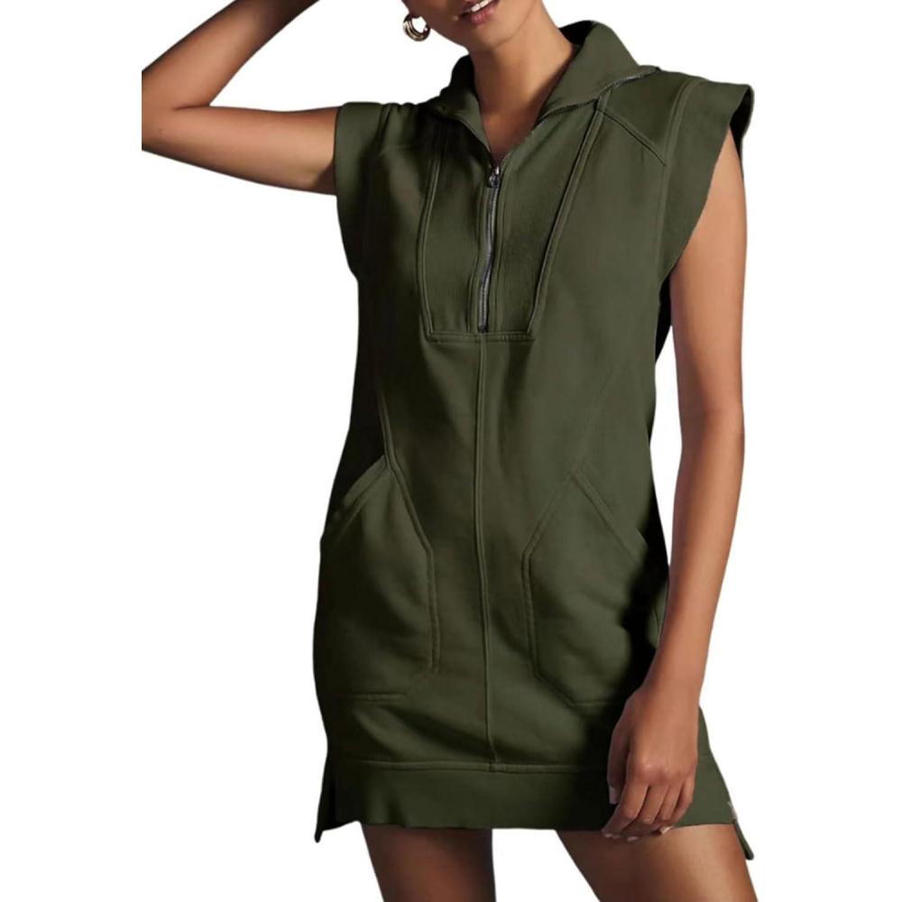 CHARTOU Women Plain Half Zip Sweatshirt Dress Sleeveless Hoodie Mini Dress Summer Casual V Neck Tunic Dress Pocket(Army Green)