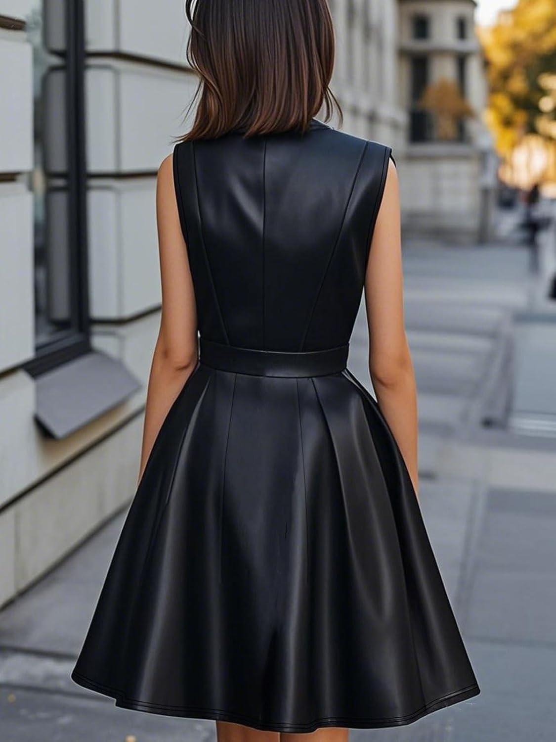 Women PU Faux Leather Dress Elegant Sleeveless Belted V Neck Casual Party Mini Dress with Pockets PU leather dresses for women office work/ Stylish cinched waist pleated short dress with belt/ Office work black leather dress with flare hem vintage green leather dress trendy a line dress for women wedding guest mini leather dress sleeveless cinched waist a line dress with a gold-buckle belt flare pleated dress with swing hem holiday party outfits for women coffee brown leather dress a line mini dress women sleeveless faux leather dress belted party mini dress v neck black party dress elegant pu leather dresses for women casual work pleated short dress for formal olive green leather dress western gold buckle business dress wedding guest dress