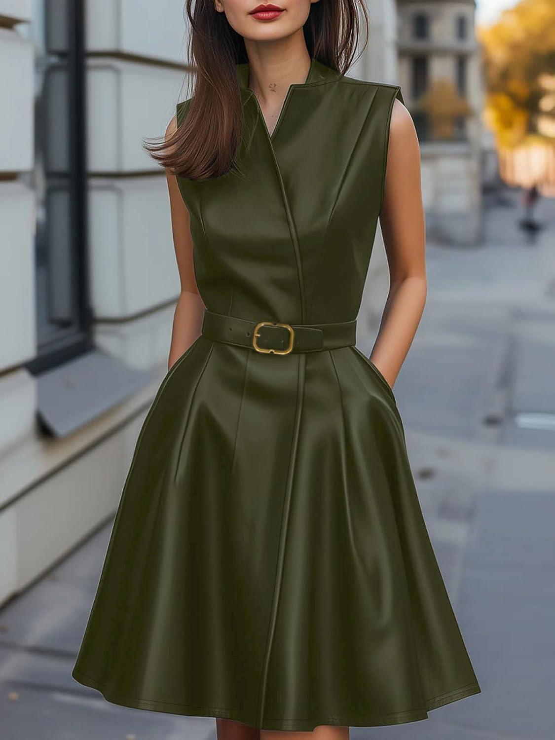 CHARTOU Women PU Faux Leather Dress Elegant Sleeveless Belted V Neck Casual Party Mini Dress with Pockets(Green)