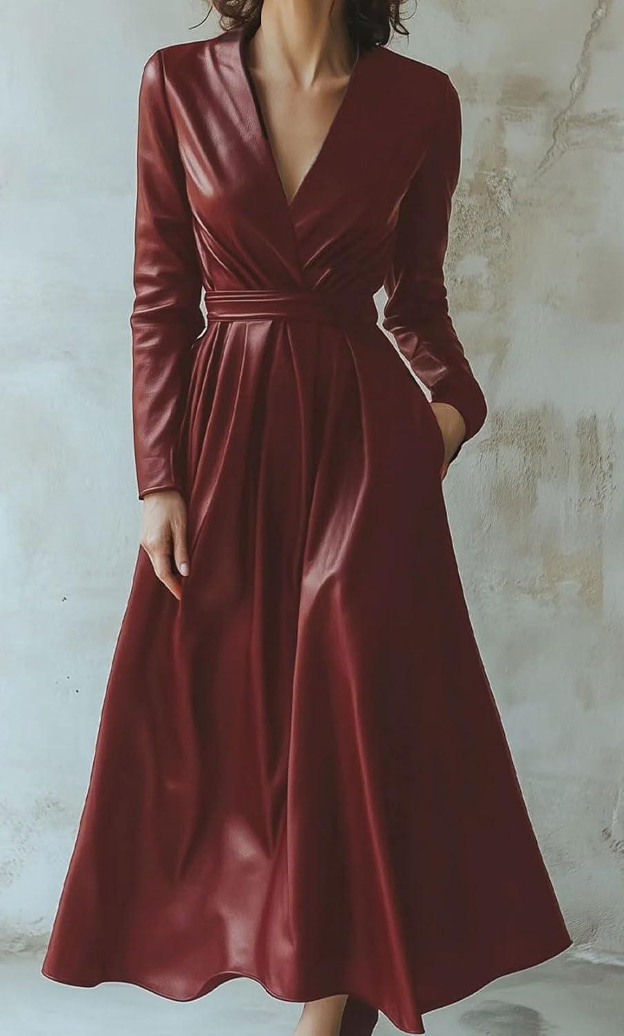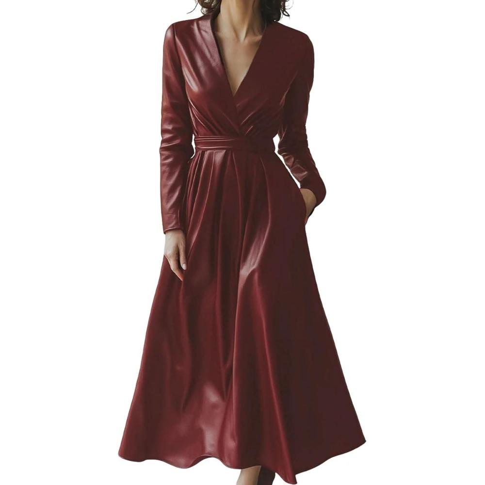 CHARTOU Women PU Faux Leather Long Sleeve Dress Deep V Neck Flowy Night Out Party Dress with Belt(Wine)