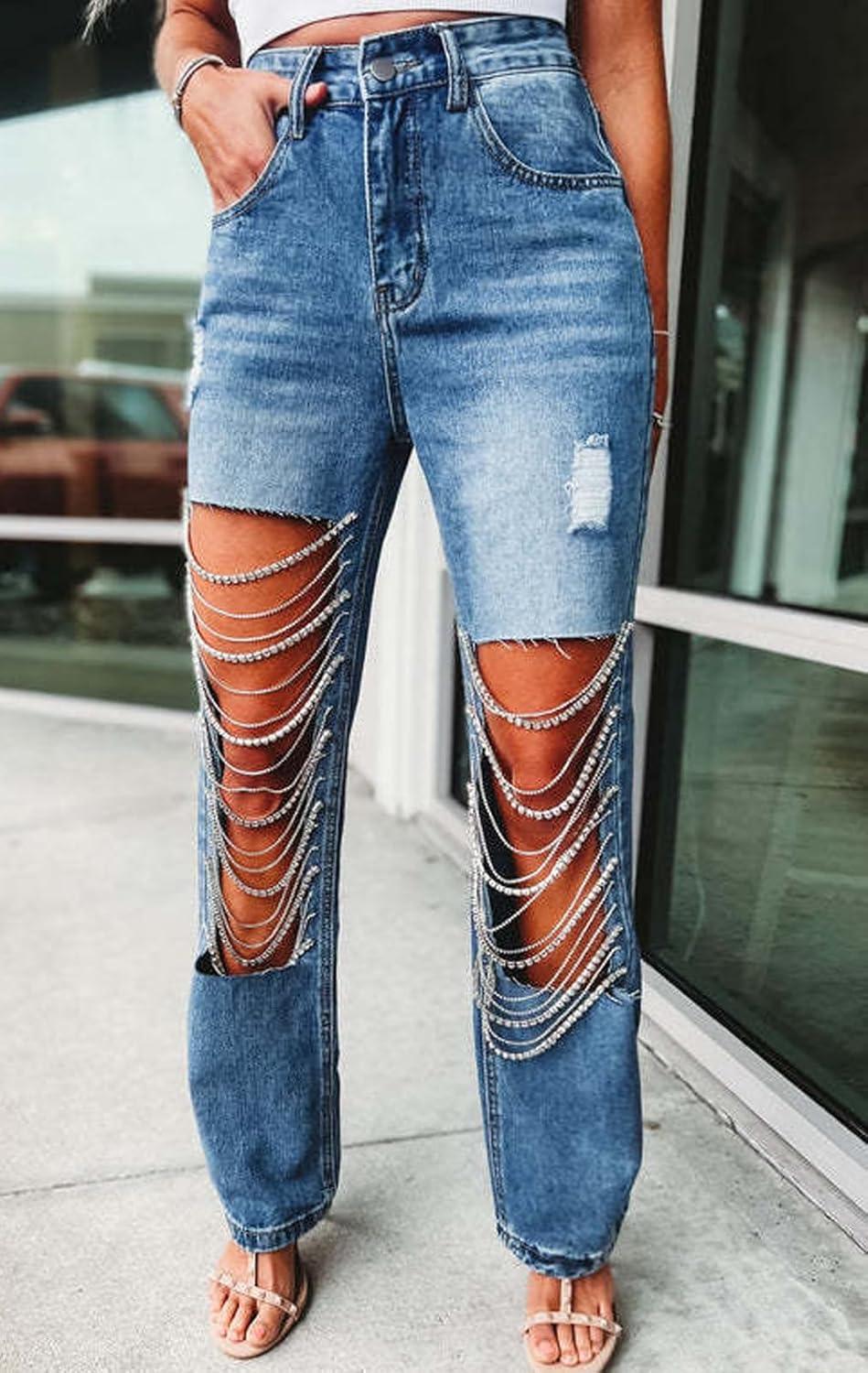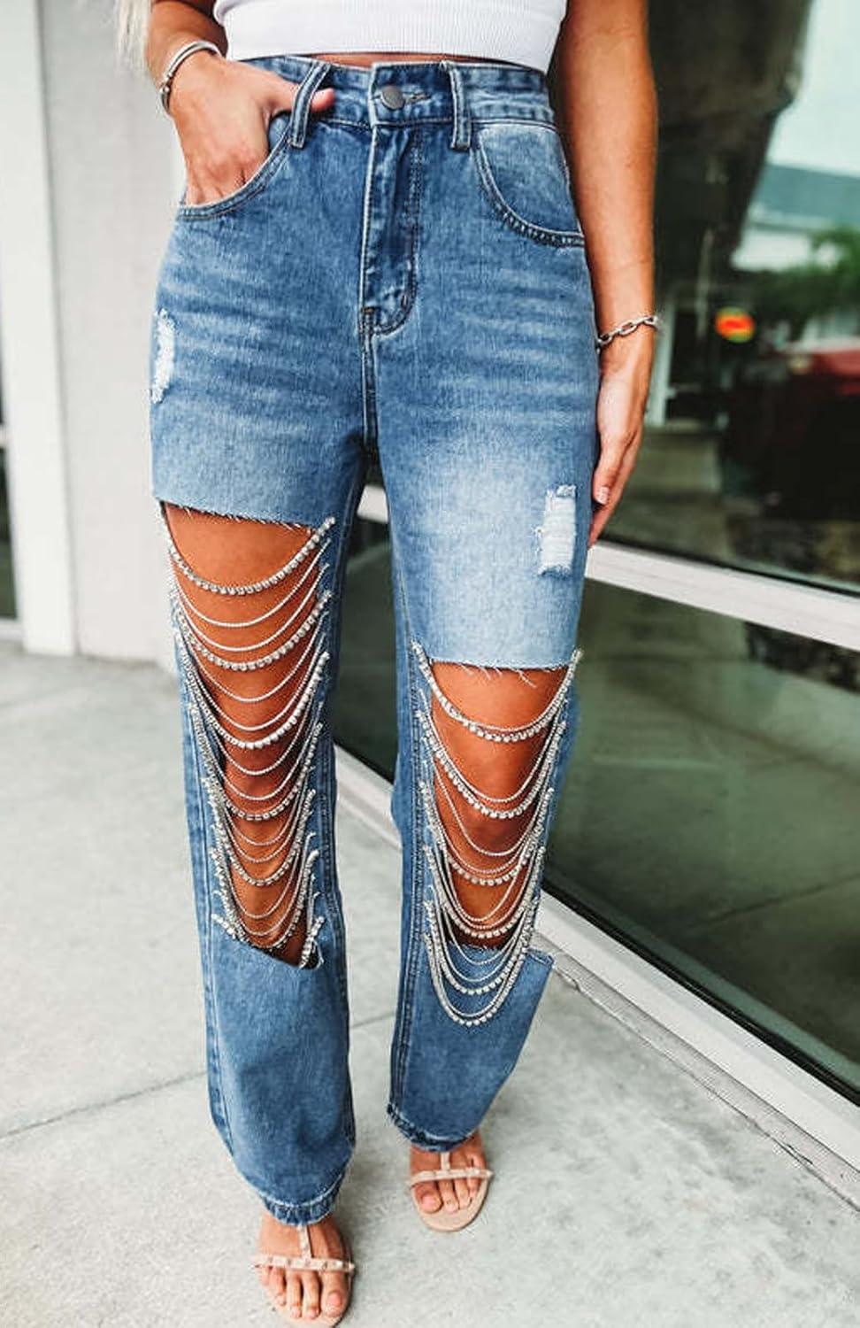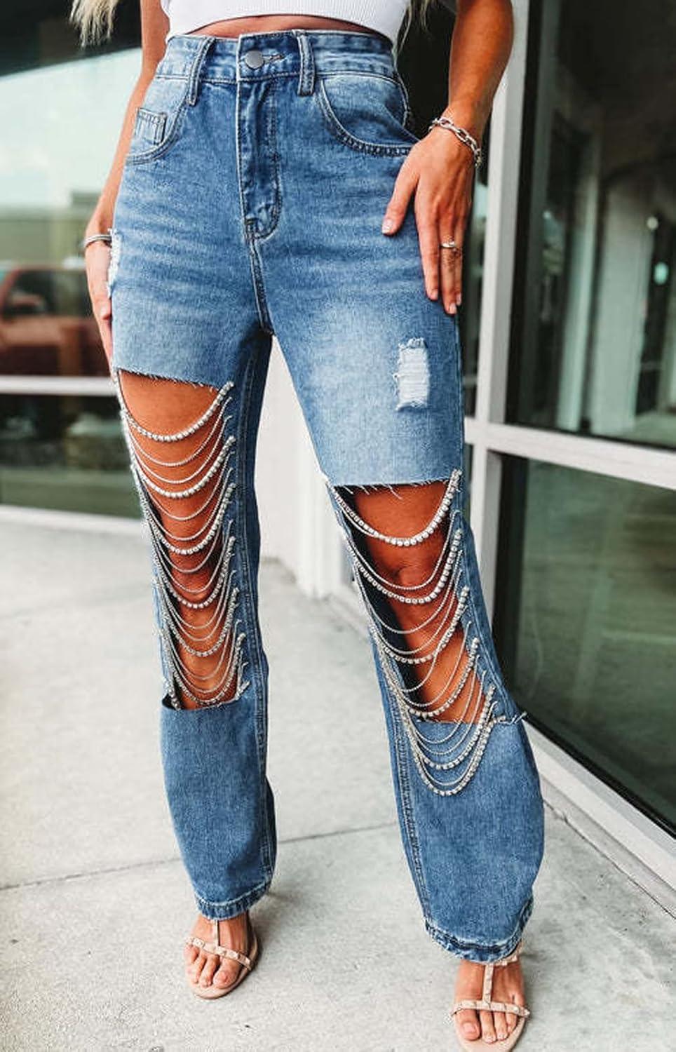 CHARTOU Women Ripped Jeans Straight Leg Denim Pants Cut Out Distressed Chain Rhinestone Jeans with Holes Y2k(Light Blue)