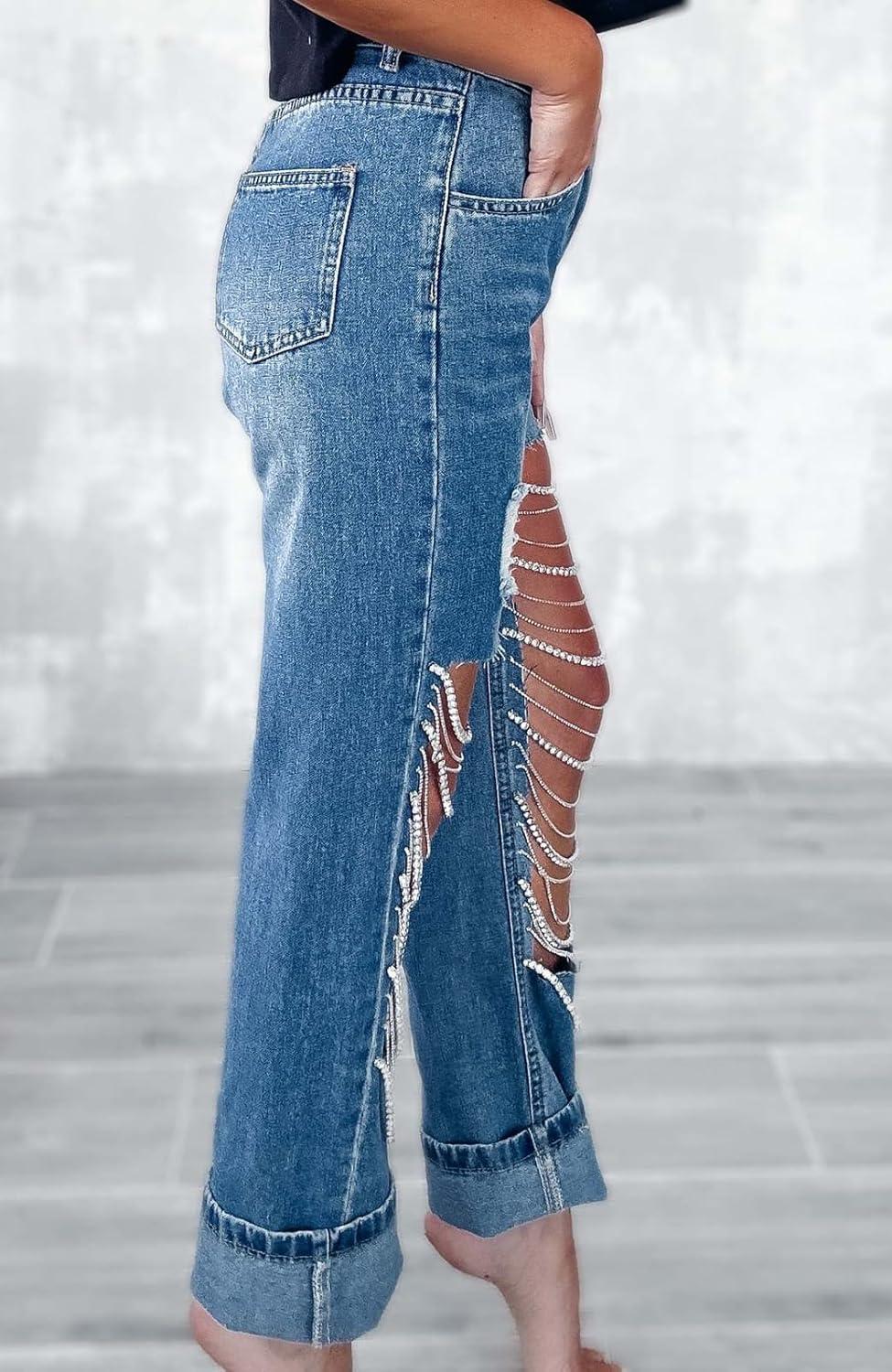 CHARTOU Women Ripped Jeans Straight Leg Denim Pants Cut Out Distressed Chain Rhinestone Jeans with Holes Y2k(Dark Blue)