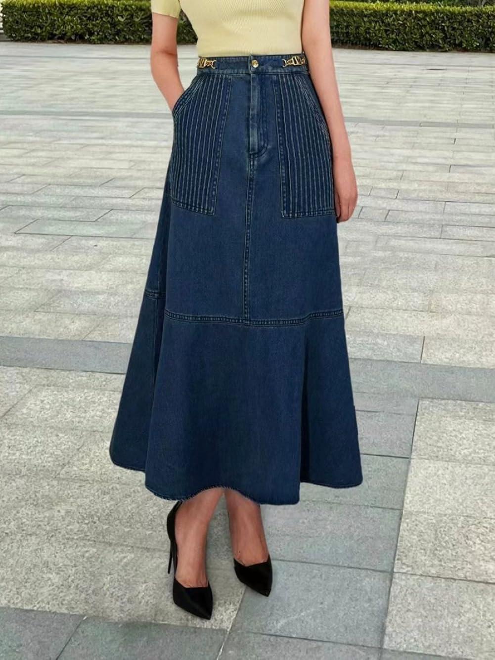 CHARTOU Women Denim Maxi Skirt/ Casual Patchwork Long Jean Skirt/ Flared High Waist A Line Skirt/ Women Trendy 2025 Vacation Outfits/ Swing Hem Denim Skirt
