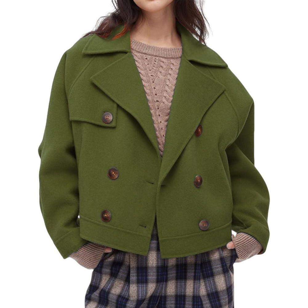 CHARTOU Women Short Pea Coats Double Breast Lapel Overcoats Winter Cropped Wool Jacket(Green)