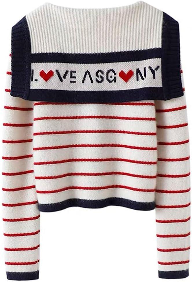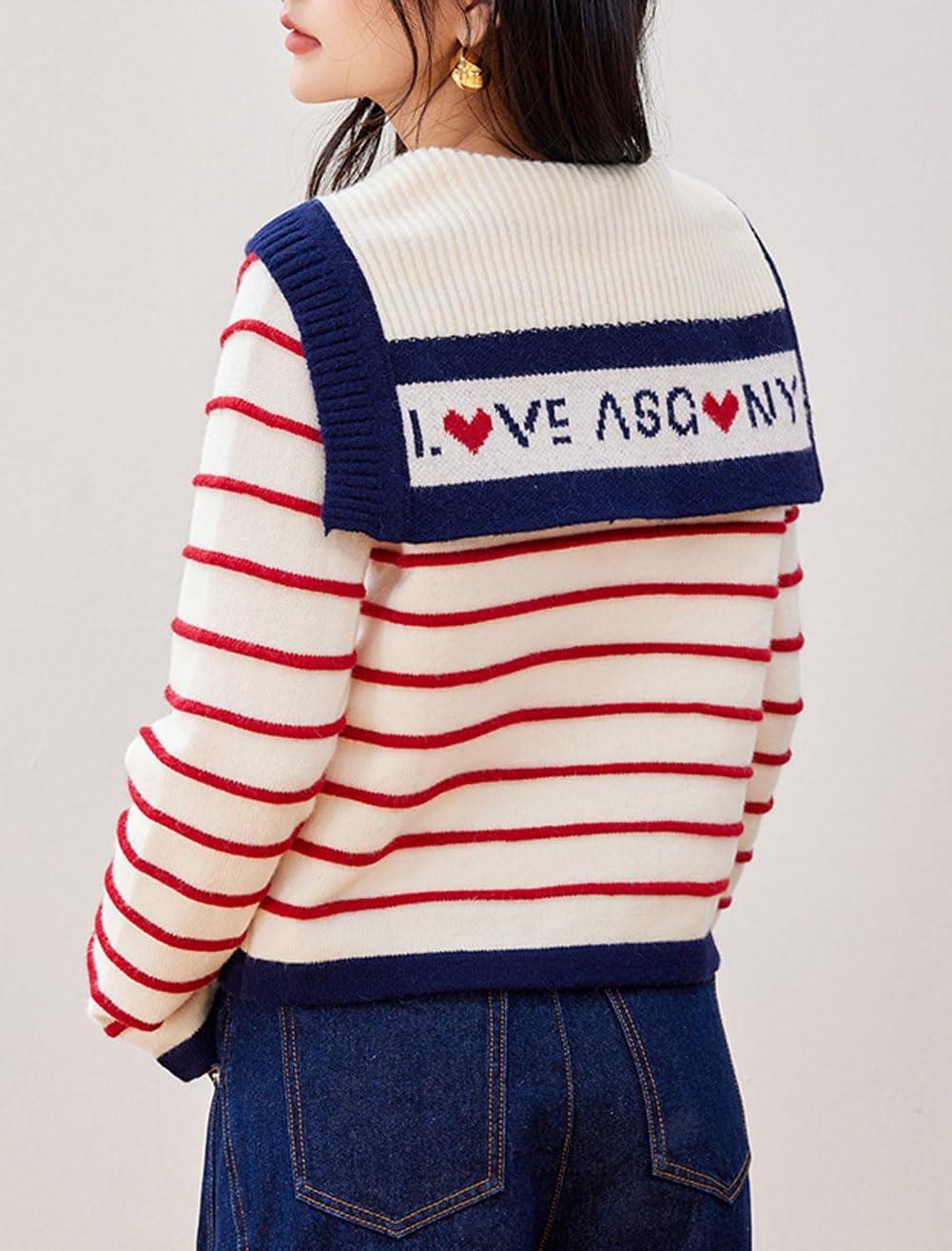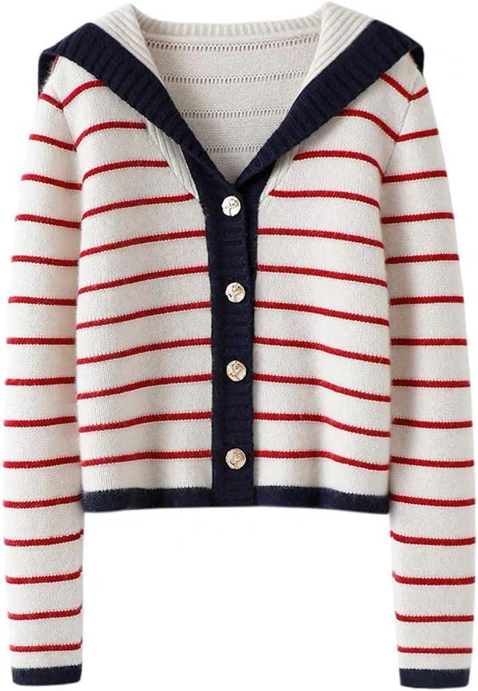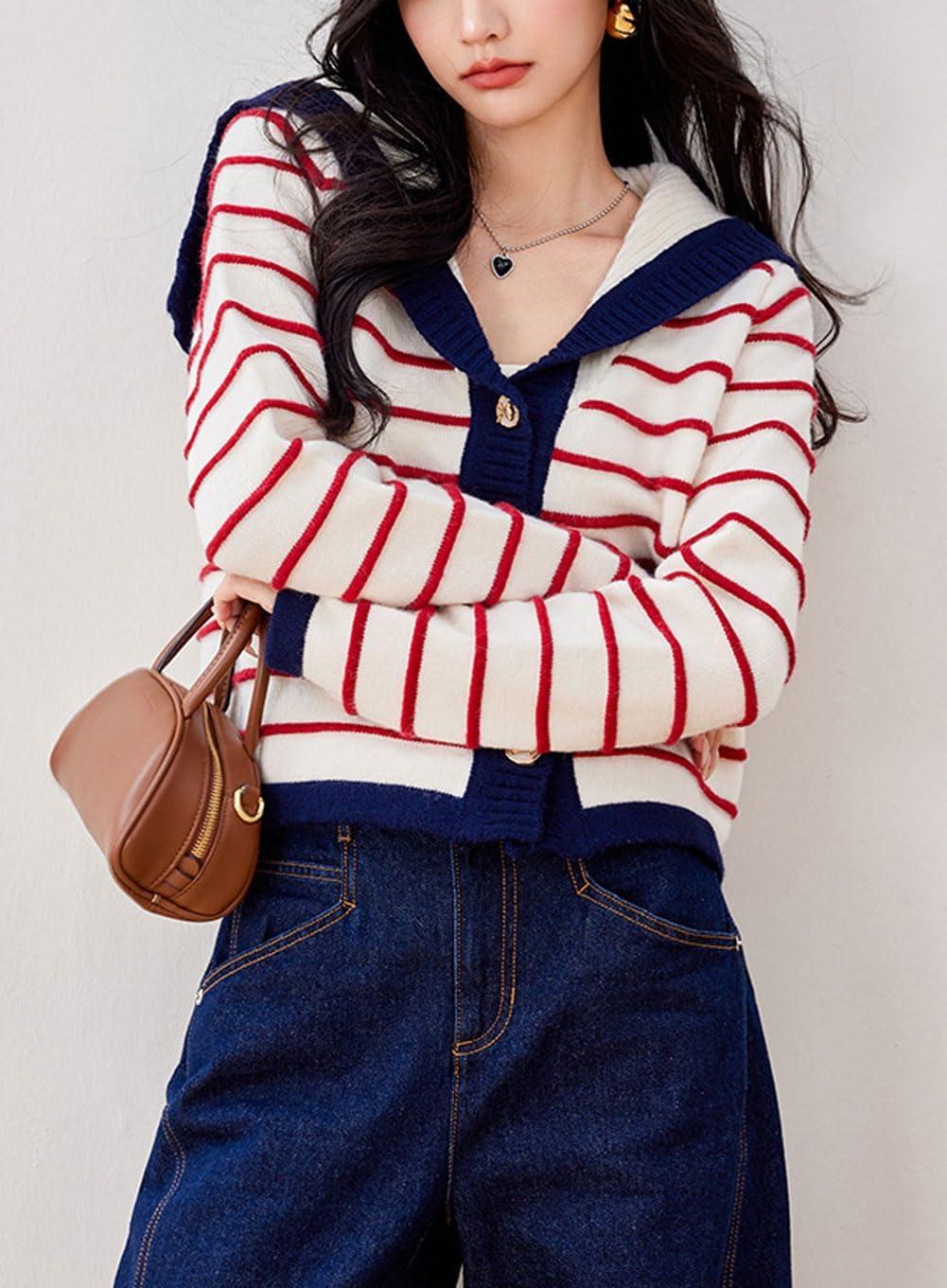 CHARTOU Women Striped Cardigan Sweater Lapel Collar Open Front Button Down Knit Cardigans; Fit Type: Regular fit/ Thickness-Medium/ Stretch: Medium/ Softness: Medium; Sailor collar cardigan: Cute sailor collar striped cardigan sweater, back letters print, perfect for adding a touch of elegance to your outfits, stylish v neck collared sweater complement your neckline; Elevate your style with sailor collar cardigan sweater for women featuring a trendy striped design, sweet v neck collared, back letters pattern, metal decorative button, long sleeve, contrast color plackets, cuffs, and hem, lightweight cardigan sweaters; Versatile Striped Cardigan: This dressy lady jacket cardigans is fitted for women fall casual striped open front cardigan, black and white striped cardigan for women fall fashion outfits, unique back letters print preppy sweater cardigans for y2k girl school, lapel collar contrast color short cardigans jacket fashion winter sweater tops, cozy stripe elegant dressy cardigan evening party outfits; Size Guide: XS=US(0-2), S=US(4-6), M=US(8-10), L=US(12-14), XL=US(16-18); This sailor collar striped cardigan sweater can be dress up or down for your causal look or semi-formal occasions