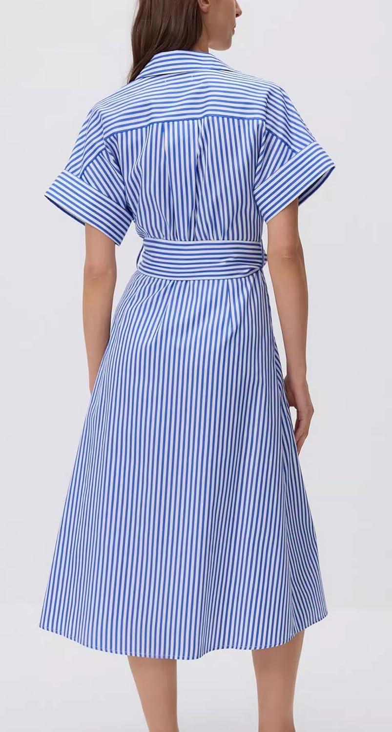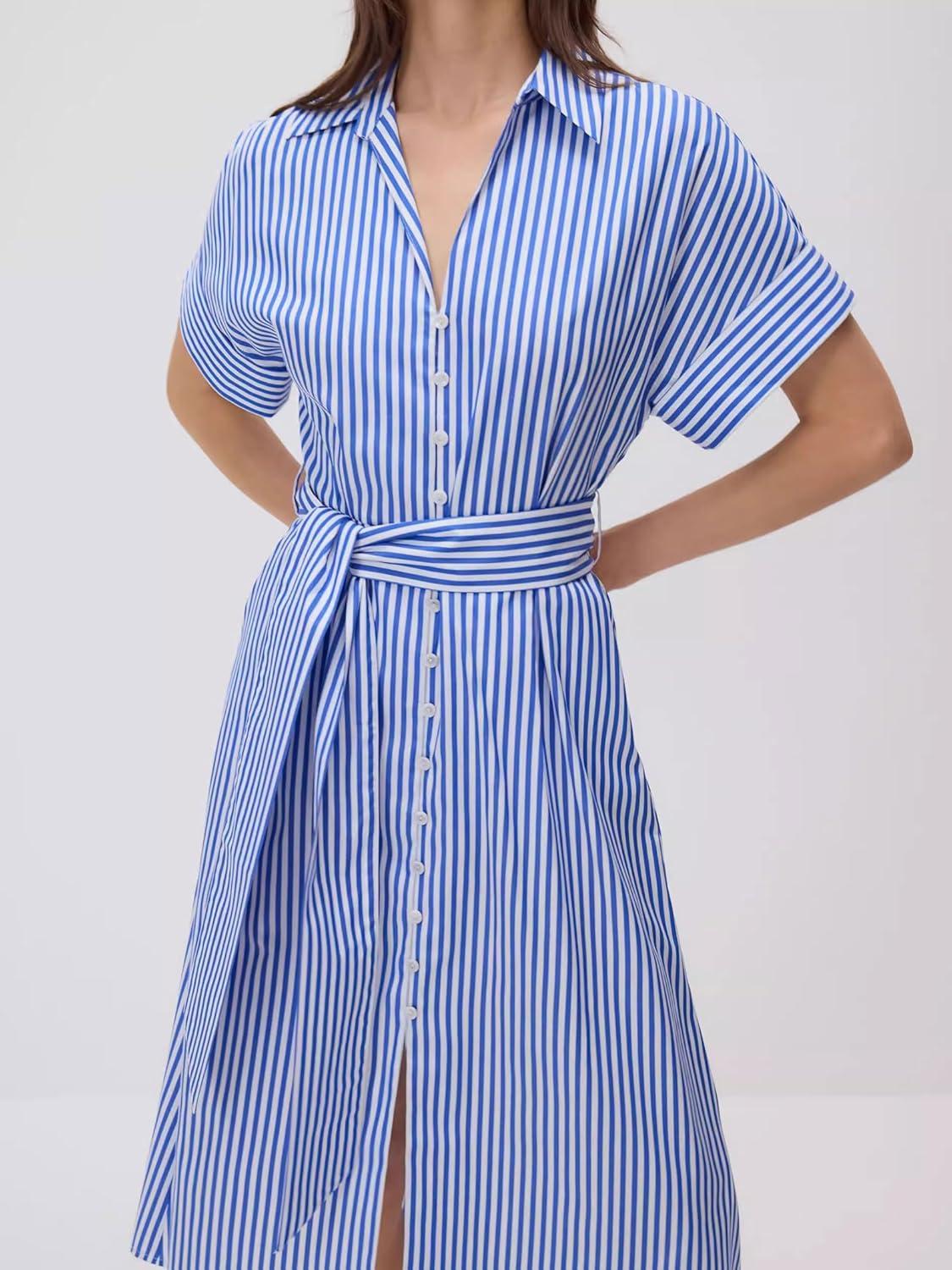 Women Striped Summer Dresses 2025 Short Sleeve Color Block Casual Button Down Shirt Dress with Belt; Loose fit/ Stripe short sleeve dress/ Summer cotton dress/ Elegant color block dress with belt; Navycore Style Long Dress: Comfortable cotton material combine with causal loose fit style long summer dress, offer a ultra relaxed wearing experience; Summer Casual Long Dress: Short sleeve stripe long dress with front button, and tie waist detail, adding a touch of office outfits, for summer business causal work dress; Versatile Long Stripe Dress for Women: Whether you heading to your office wear this midi long stripe stripe shirt dress, or on vacation as a travel outfits, summer beach cover up long dress, summer casual go to outfits, this stripe long summer dress is a addition for your wardrobe