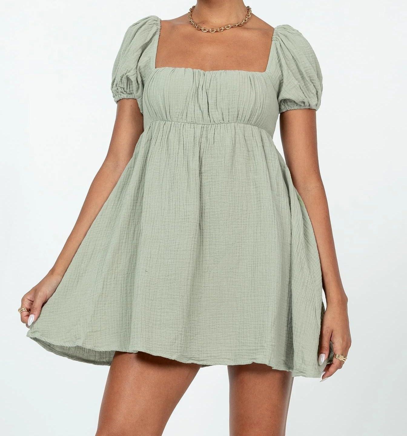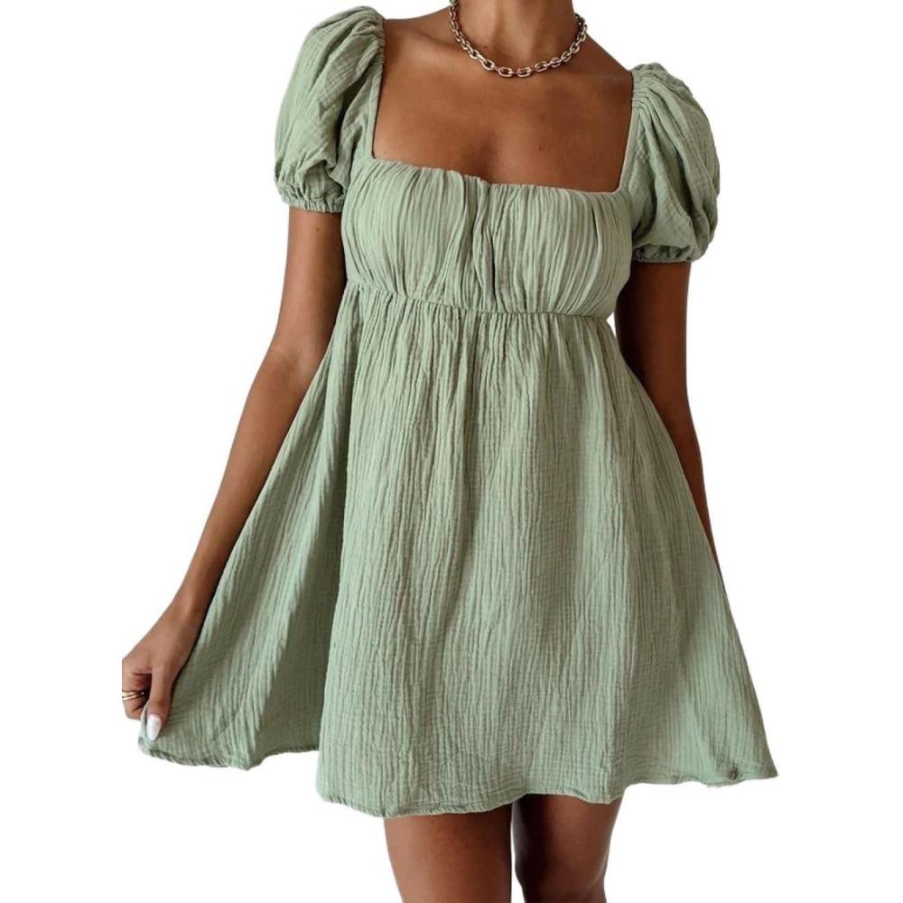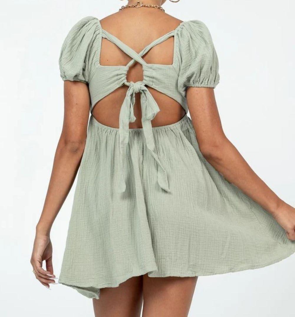 CHARTOU Women Summer Back Bow Tie Mini Dress Square Neck Puff Short Sleeve High Waist A Line Dress(Green)