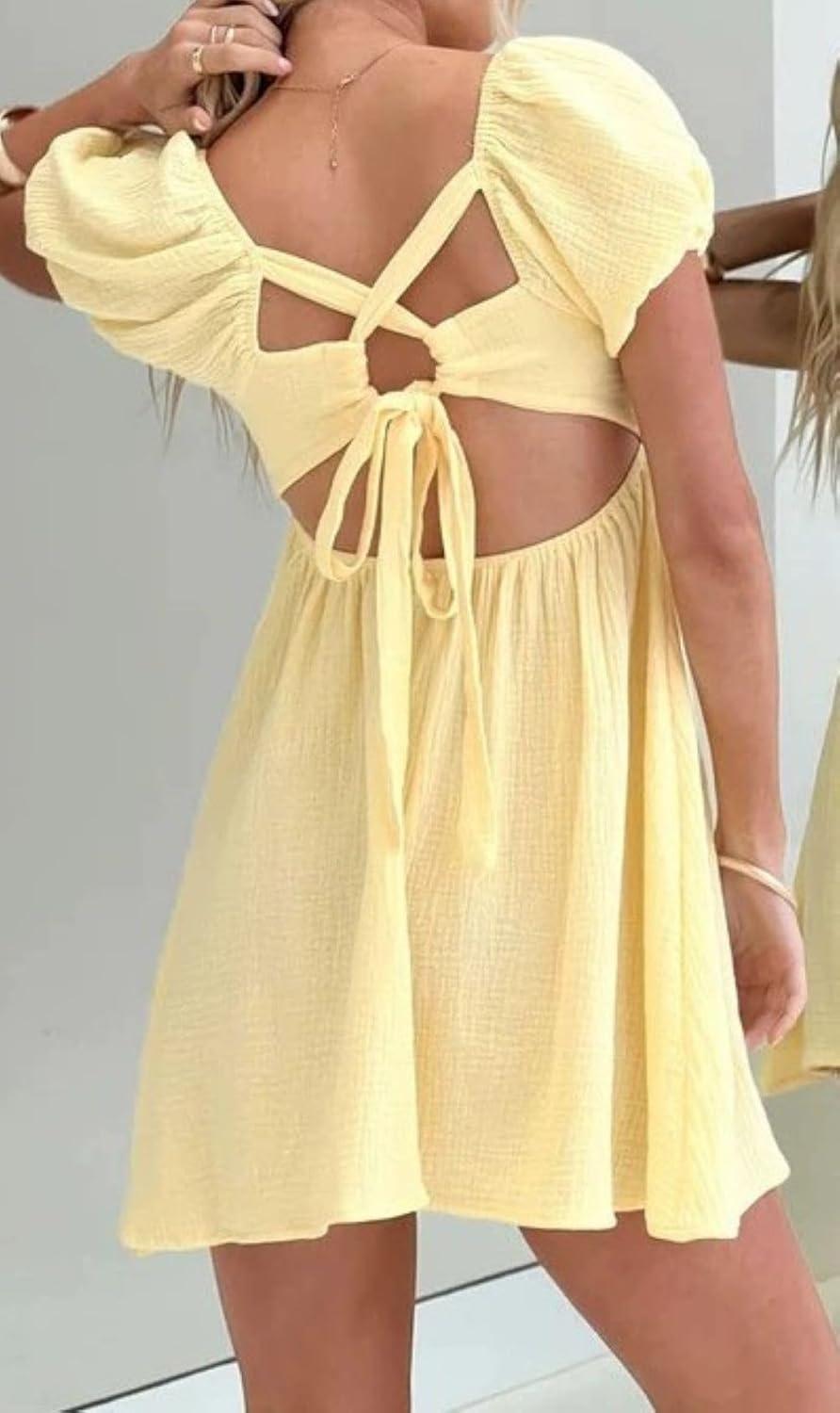 Summer Back Bow Tie Dress/ Square Neck Casual Dress/ Puff Short Sleeve Summer Dress/ Criss Cross Back Vacation Dress/ High Waist A Line Dress