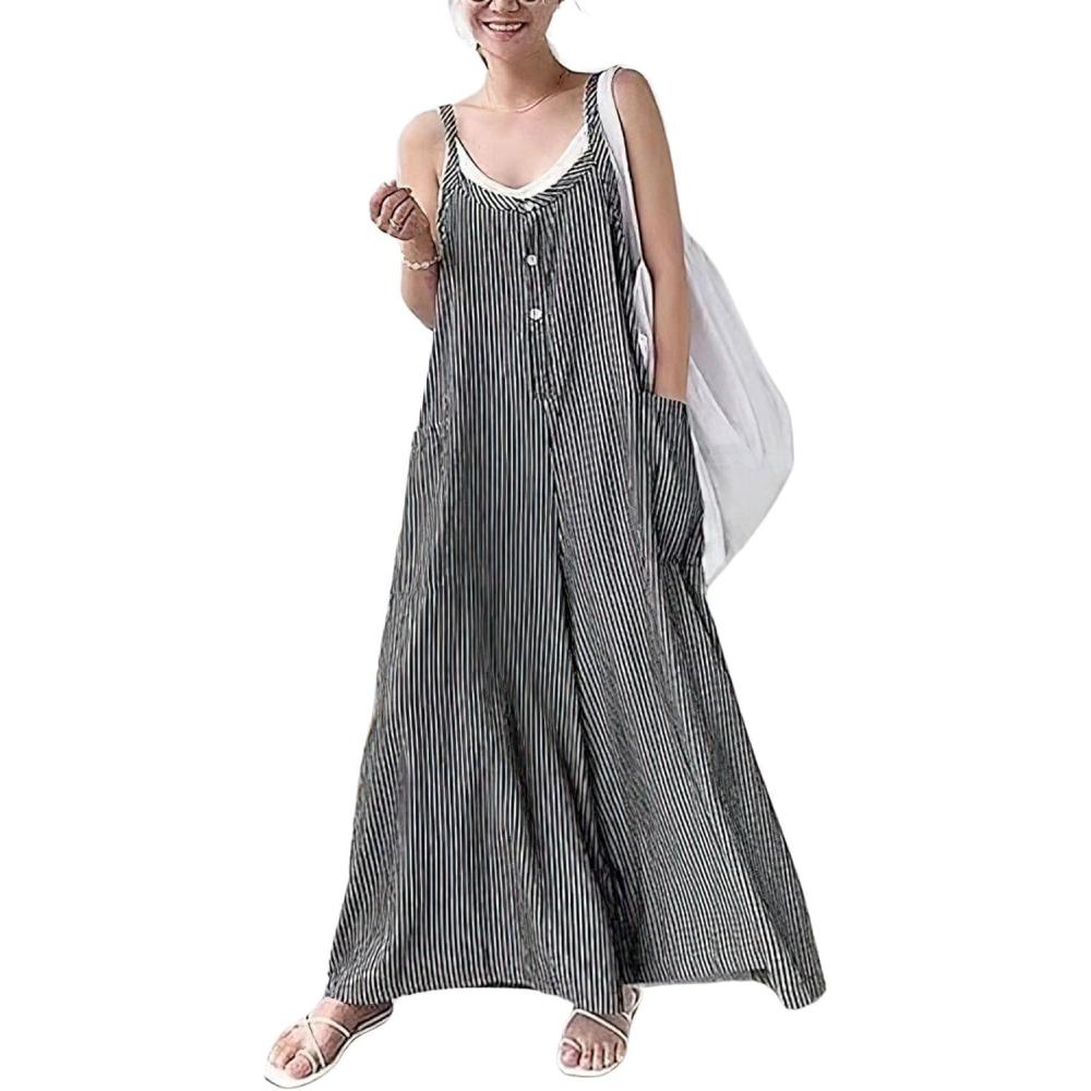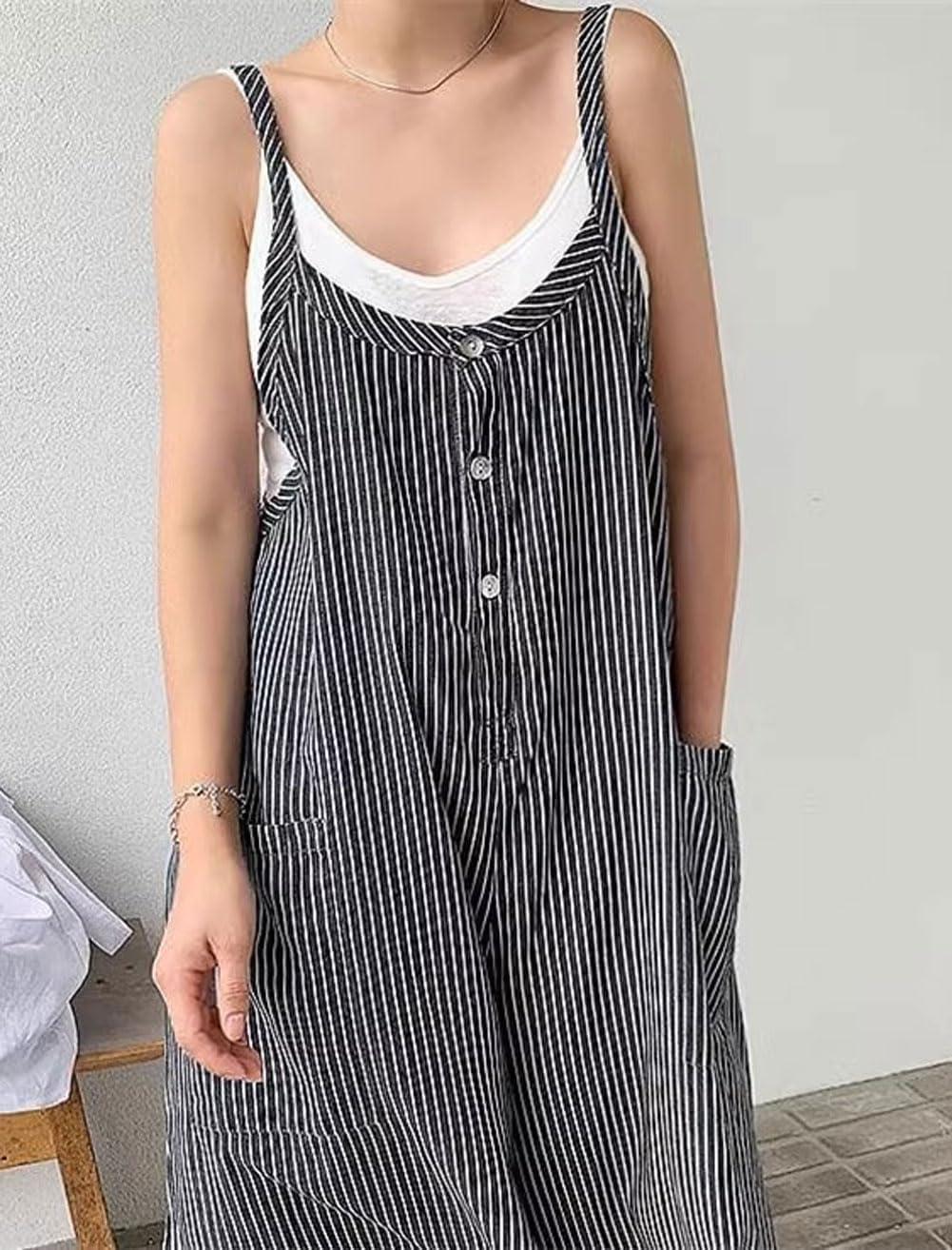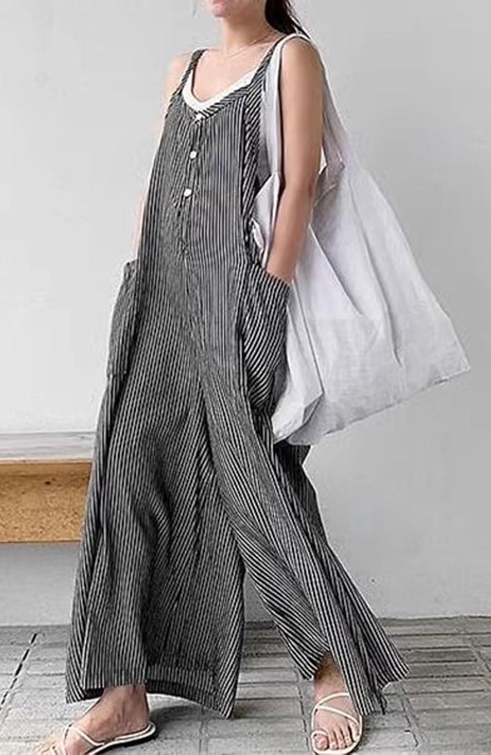 CHARTOU Women Summer Baggy Striped Jumpsuit Sleeveless Wide Leg Pants Romper Outfits(Black)