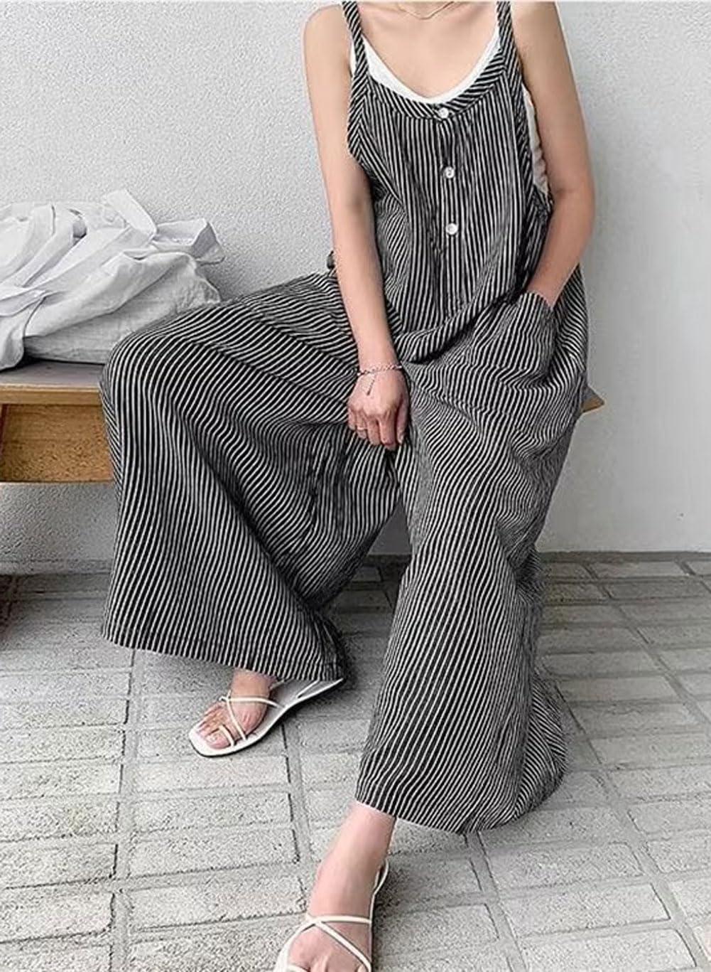 Be the first to review “CHARTOU Women Summer Baggy Striped Jumpsuit Sleeveless Wide Leg Pants Romper Outfits(Black)”