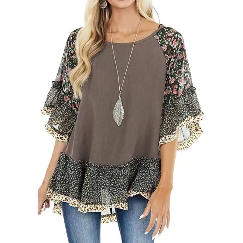 CHARTOU Women Summer Casual 3/4 Bell Sleeve Floral Print Blouse Shirt Flowy Tunic Top(Coffee)