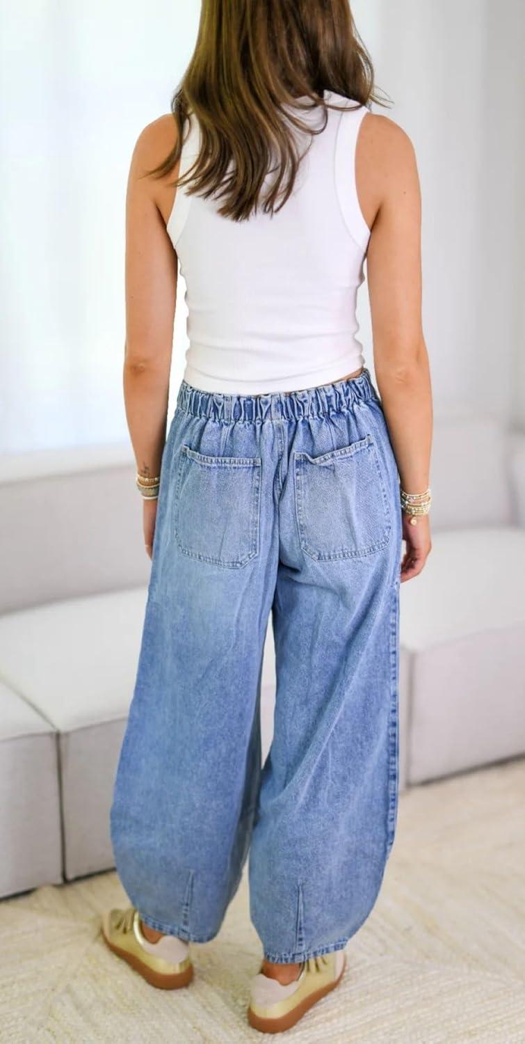 CHARTOU Women Summer Denim Pants/ Shirred Back Harem Jeans/ Drawstring Waist Cargo Pants/ Patchwork Tapered Barrel Jeans/ Boyfriends Cropped Jeans