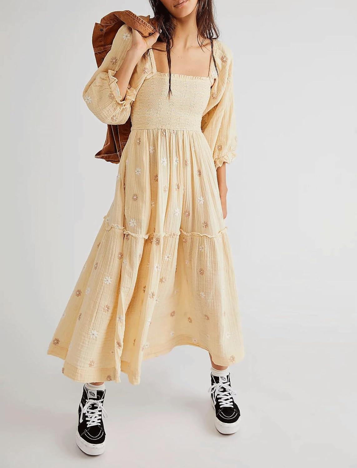 CHARTOU Women Summer Flowy Floral Dress Long Puff Sleeve Square Neck Boho Maxi Sundress Swing Smocked Dress(Apricot)