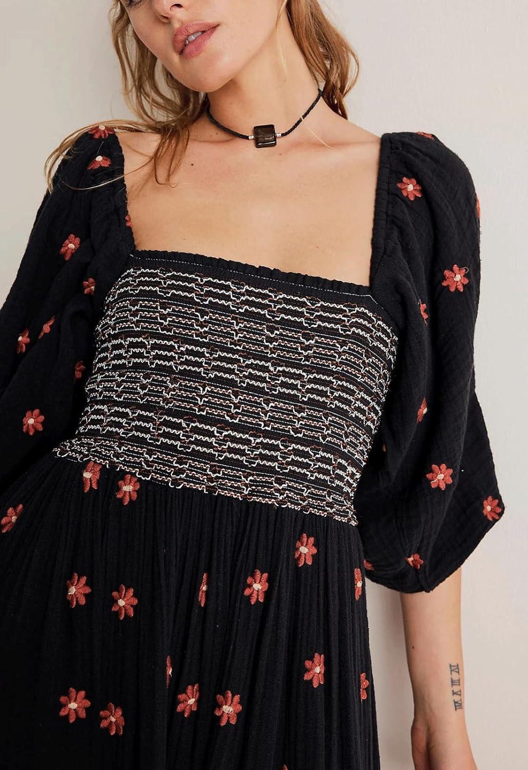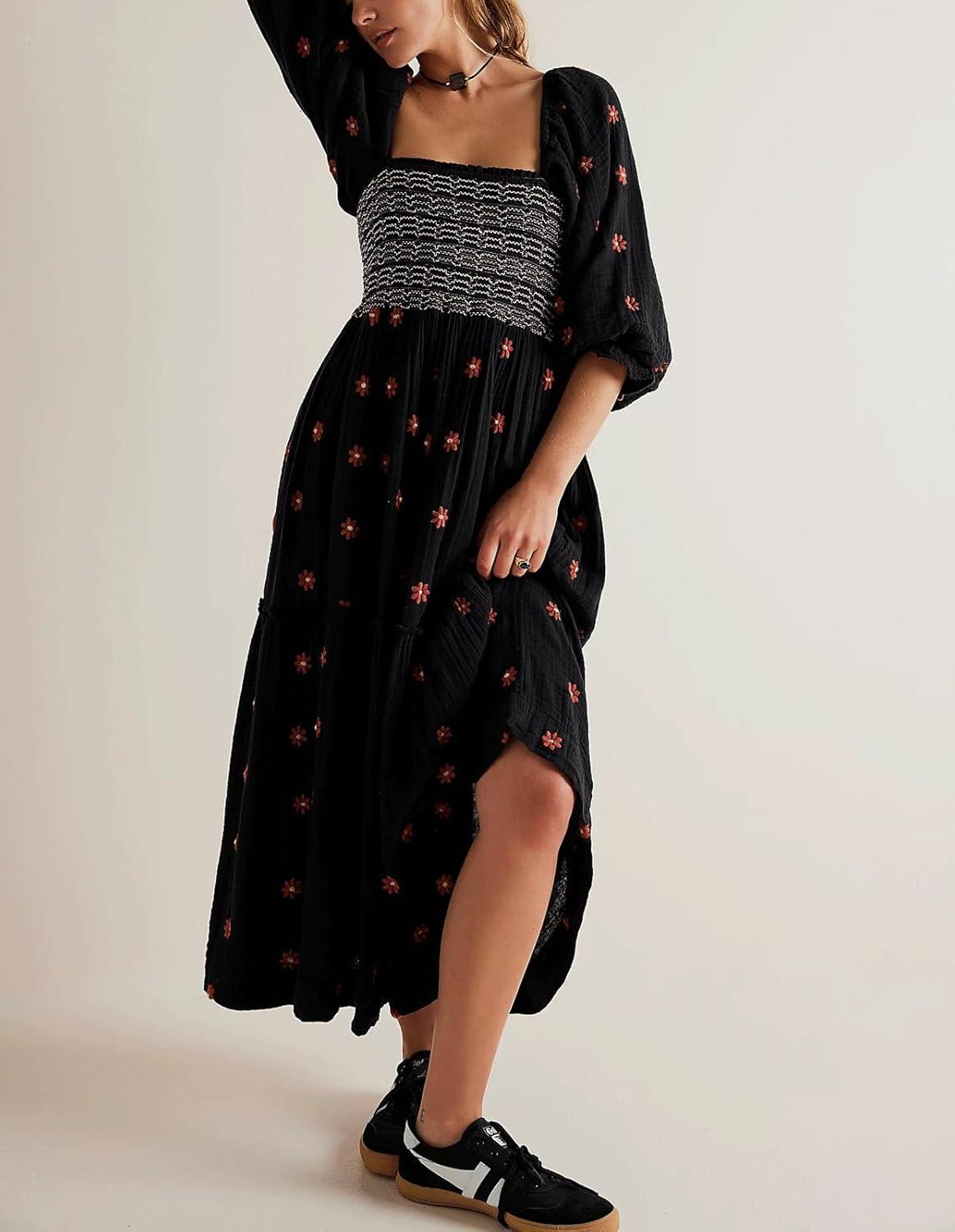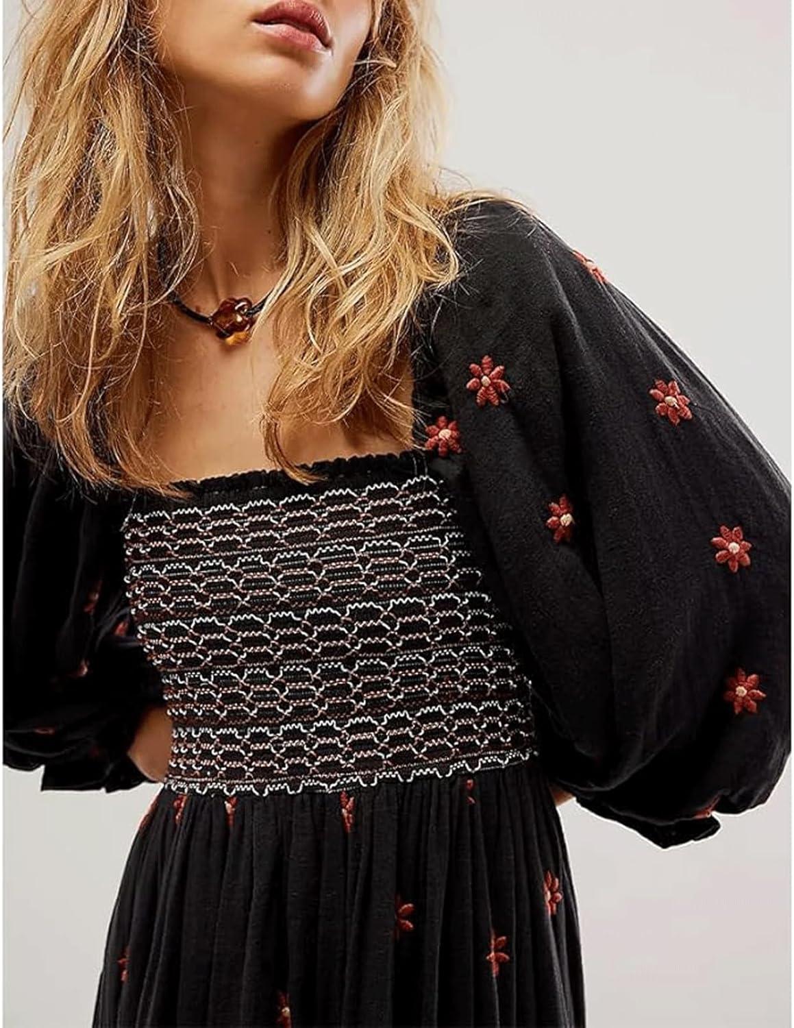CHARTOU Women Summer Flowy Floral Dress Long Puff Sleeve Square Neck Boho Maxi Sundress Swing Smocked Dress(Black)