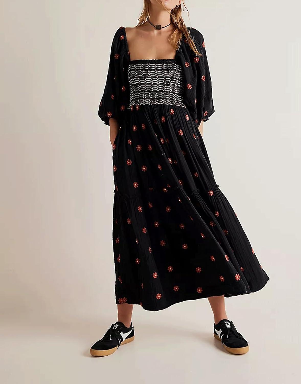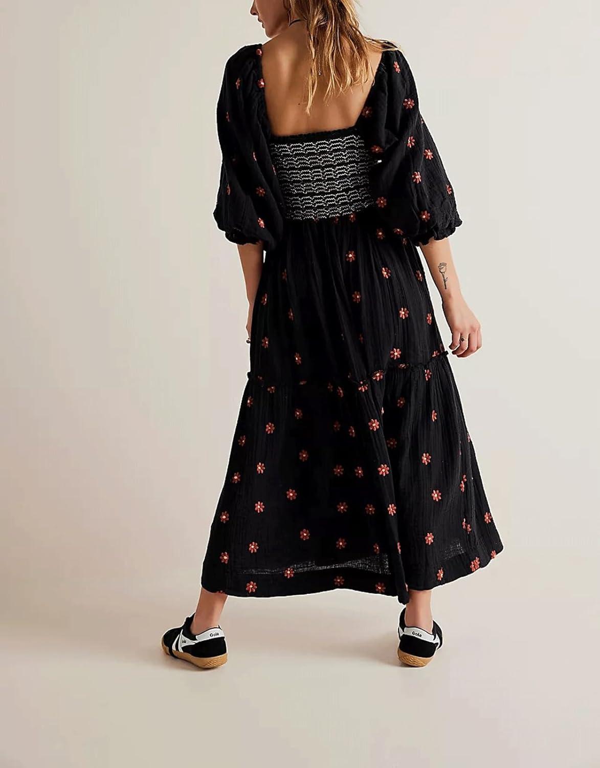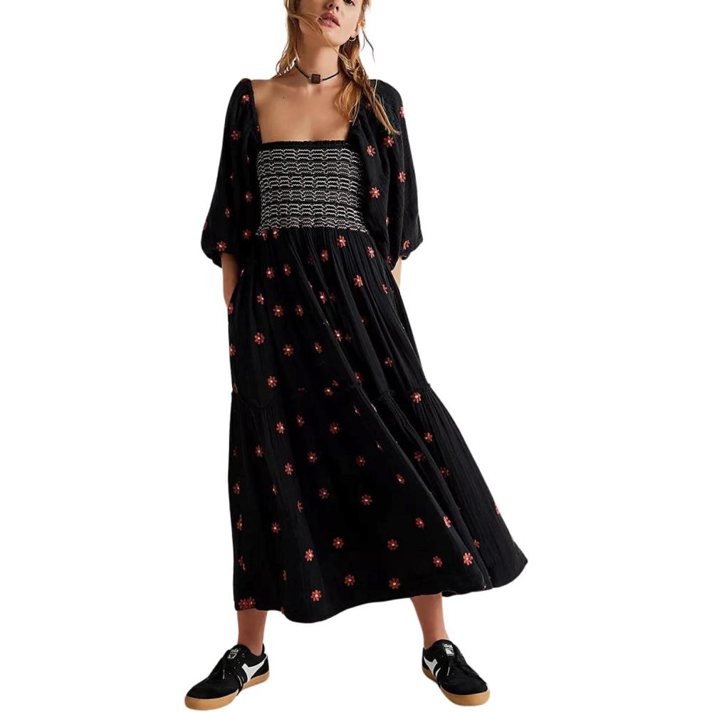 CHARTOU Women Summer Flowy Floral Dress Long Puff Sleeve Square Neck Boho Maxi Sundress Swing Smocked Dress(Black)