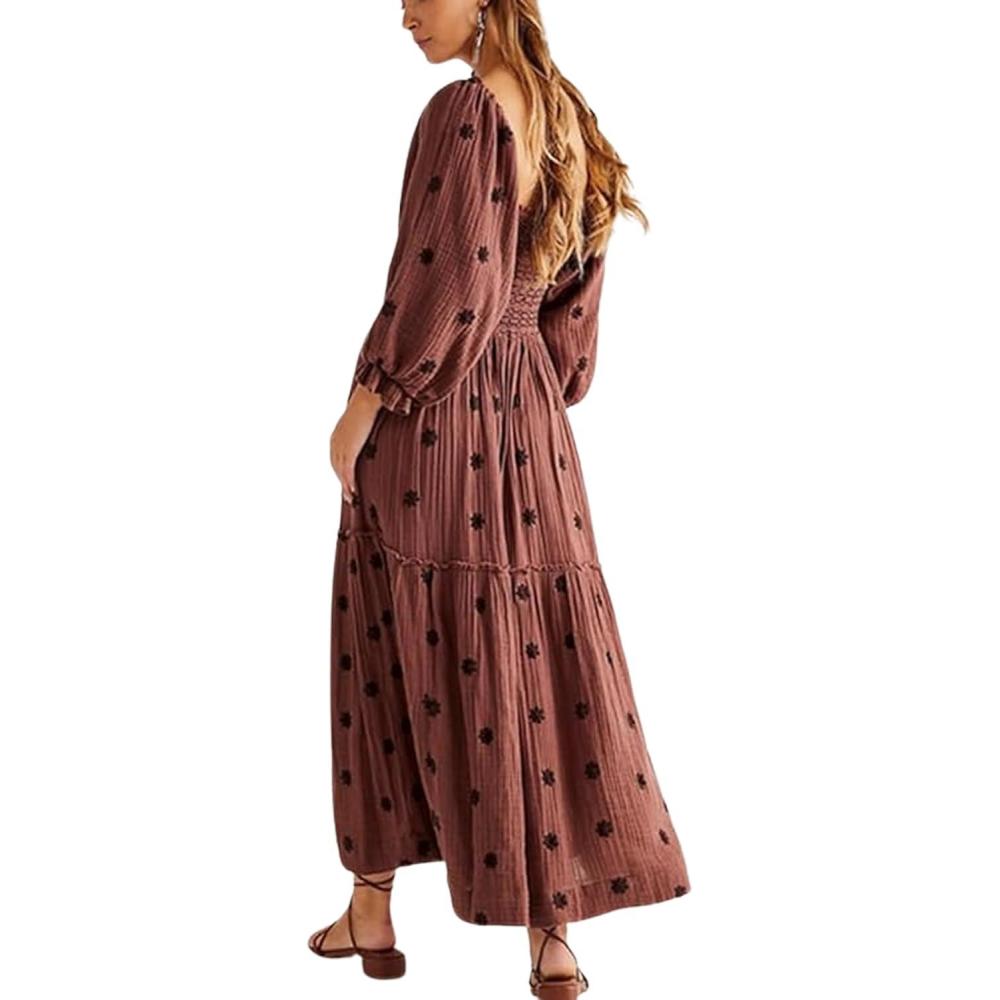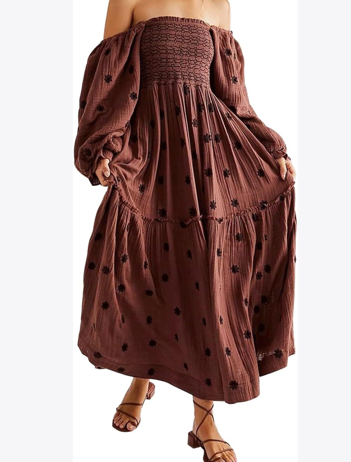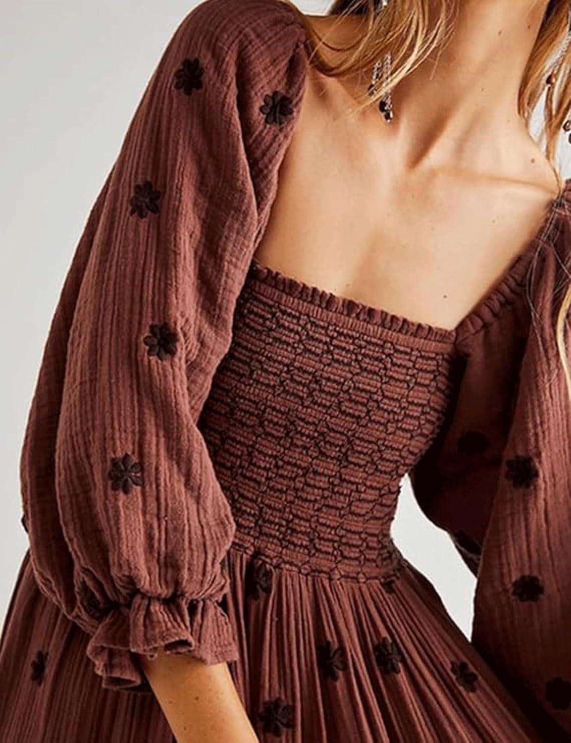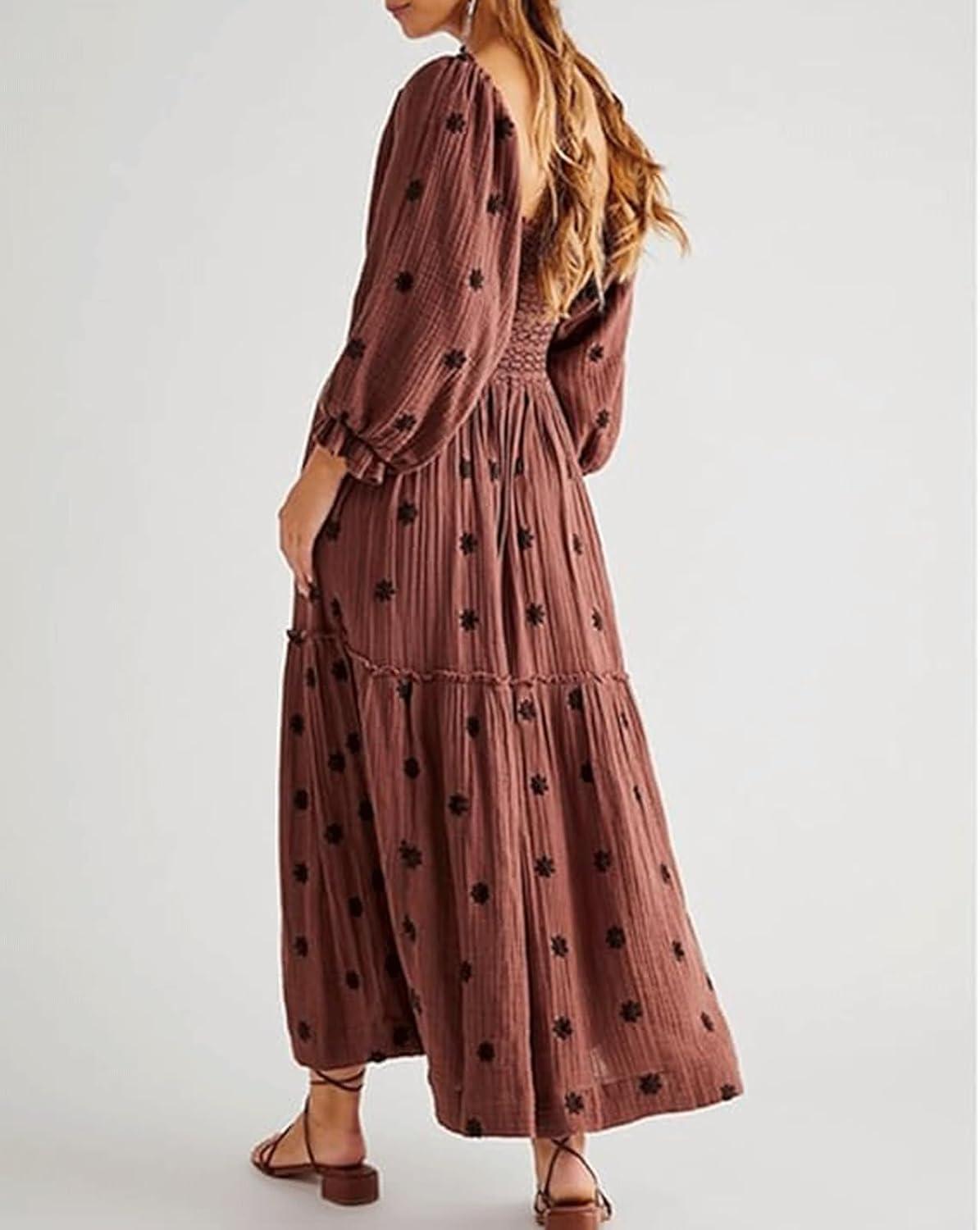CHARTOU Women Summer Flowy Floral Dress Long Puff Sleeve Square Neck Boho Maxi Sundress Swing Smocked Dress(Dark Brown)