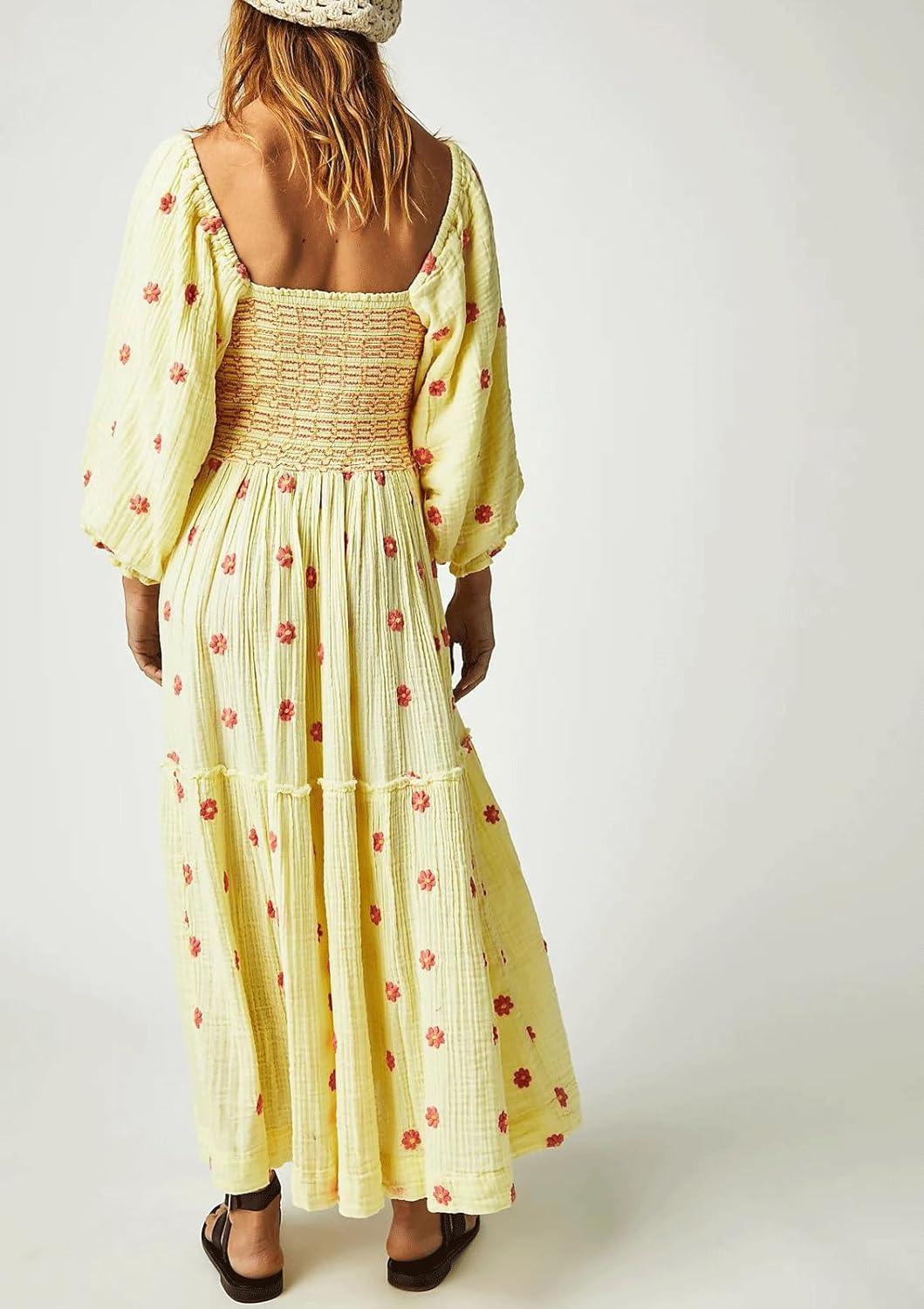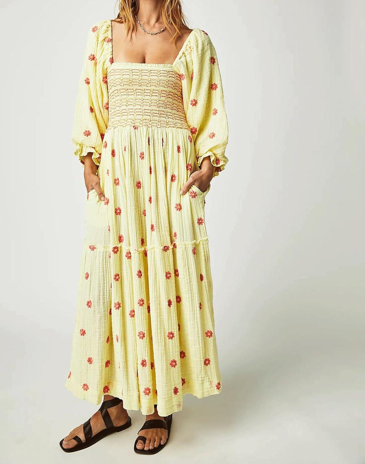 CHARTOU Women Summer Flowy Floral Dress Long Puff Sleeve Square Neck Boho Maxi Sundress Swing Smocked Dress(Light Yellow)