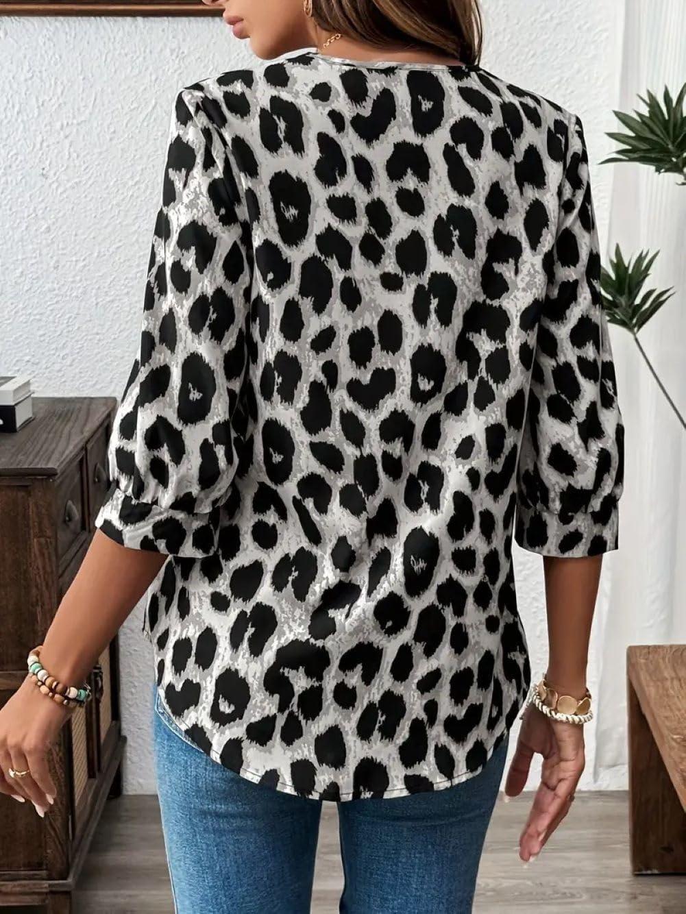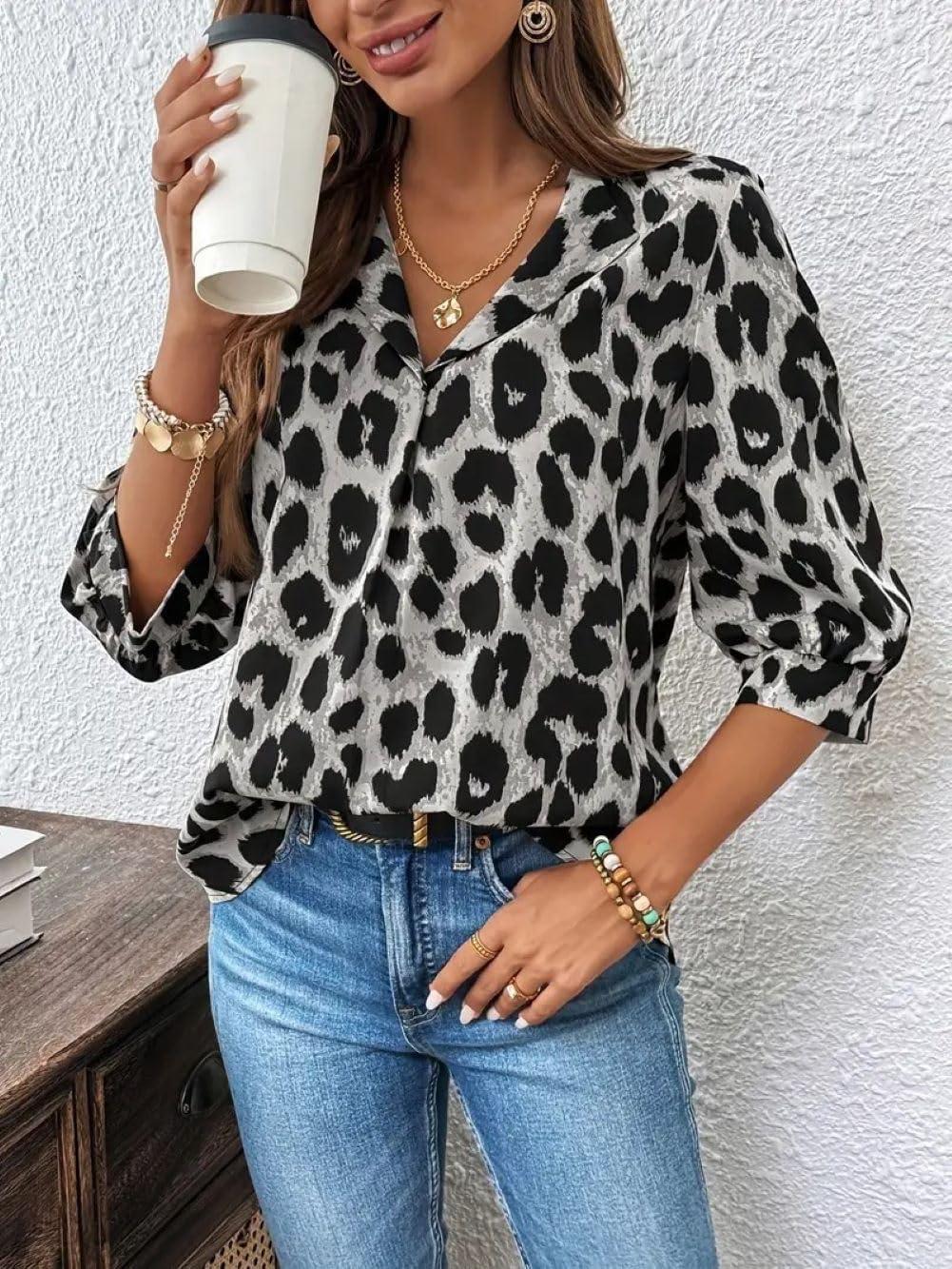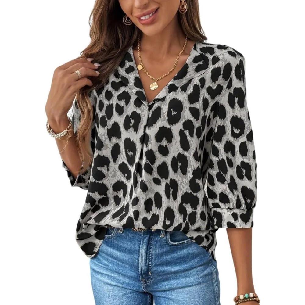 CHARTOU Women Summer Leopard Shirt Casual Loose Collared V Neck 3/4 Sleeve Tunic Top(Grey)