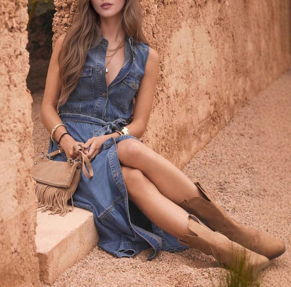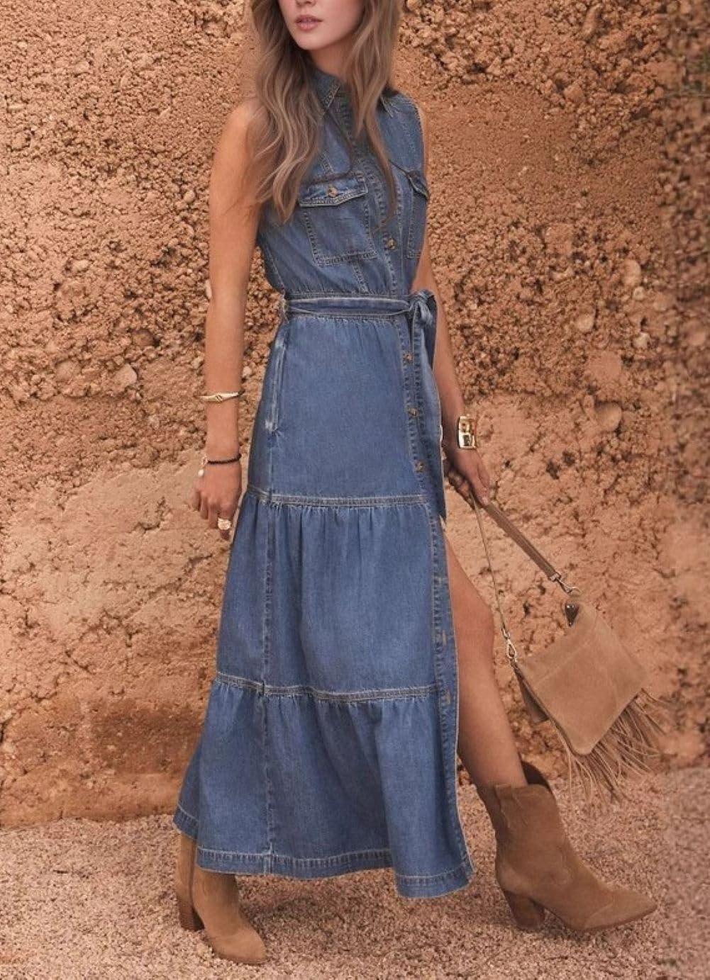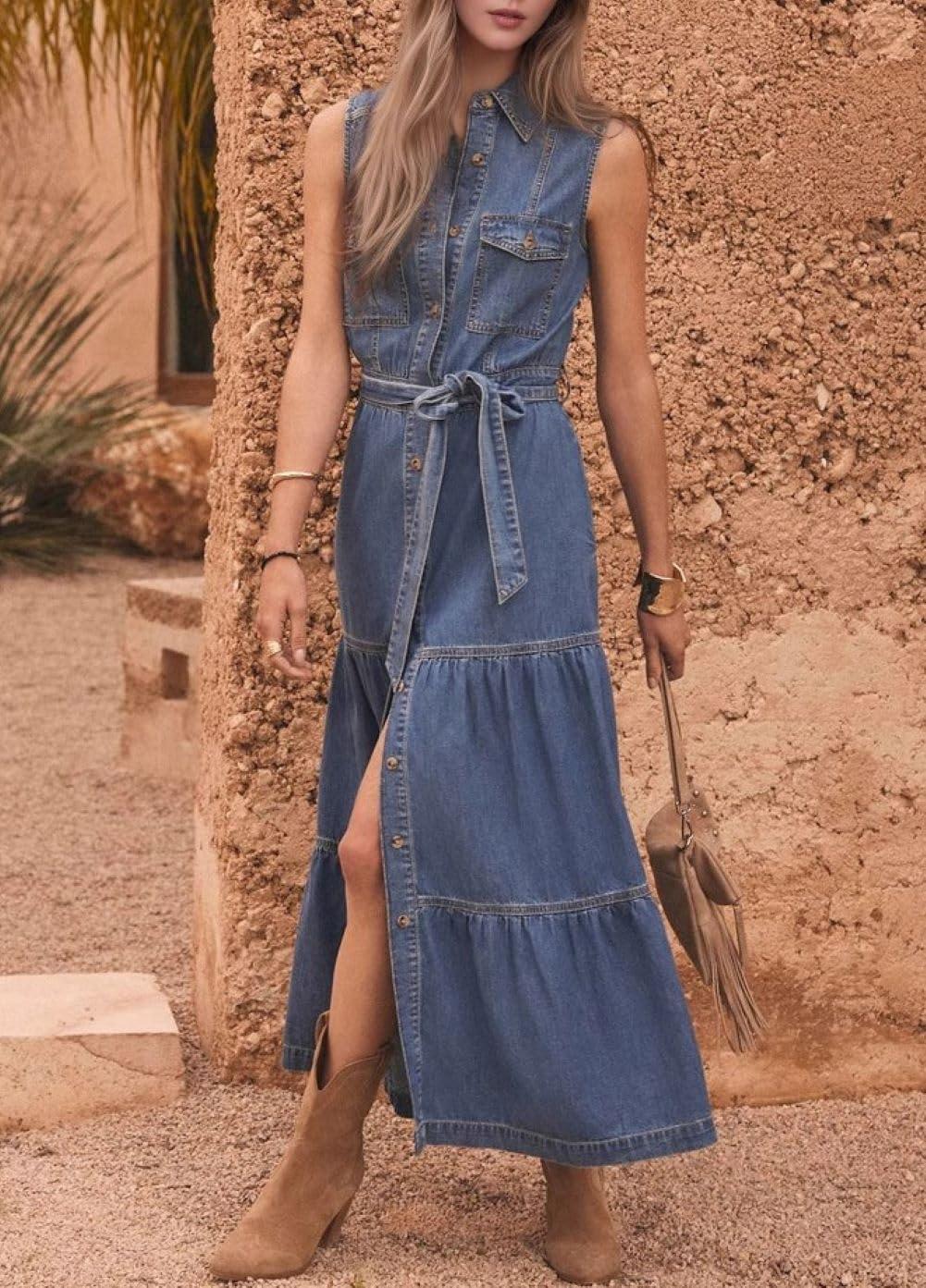Layered Denim Maxi Dress/ Women Summer Sleeveless Tank Dress/ Collared V Neck Long Dress with Pockets/ Button Down Shift Dress with Belt/ Casual Loose Fit Summer Dress