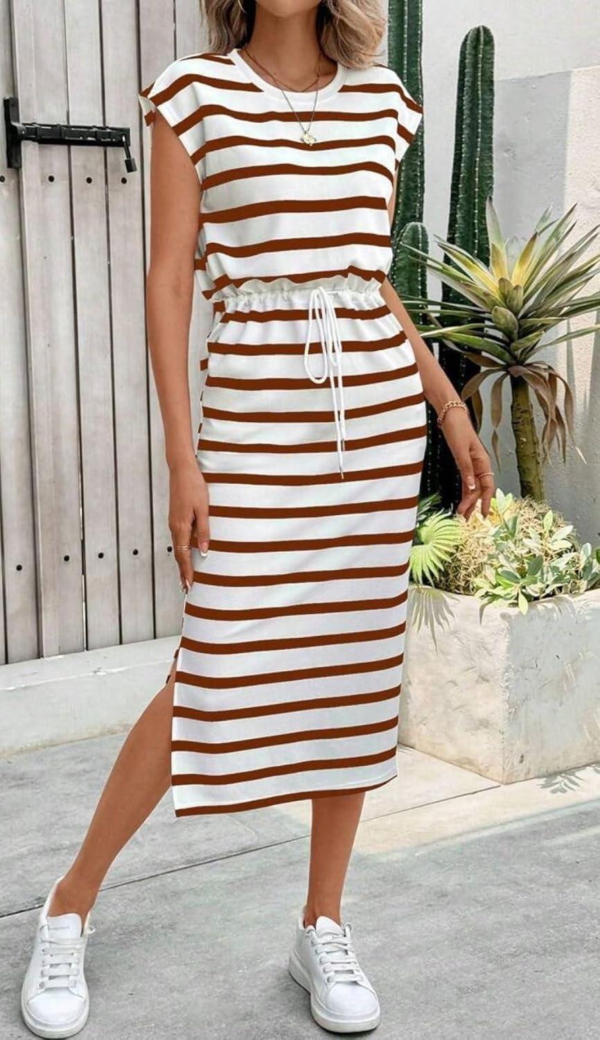 CHARTOU Women Stripes Long Dress/ Cap Sleeve Summer Vacation Dress/ Adjustable Drawstring Midi Dress/ High Waist A Line Dress/ Side Slit Summer Dress