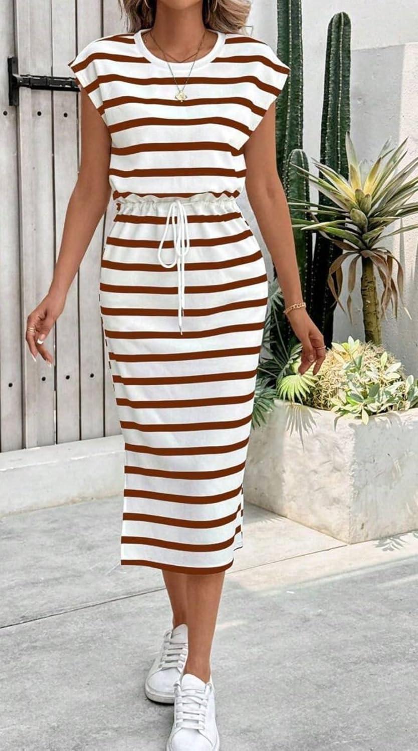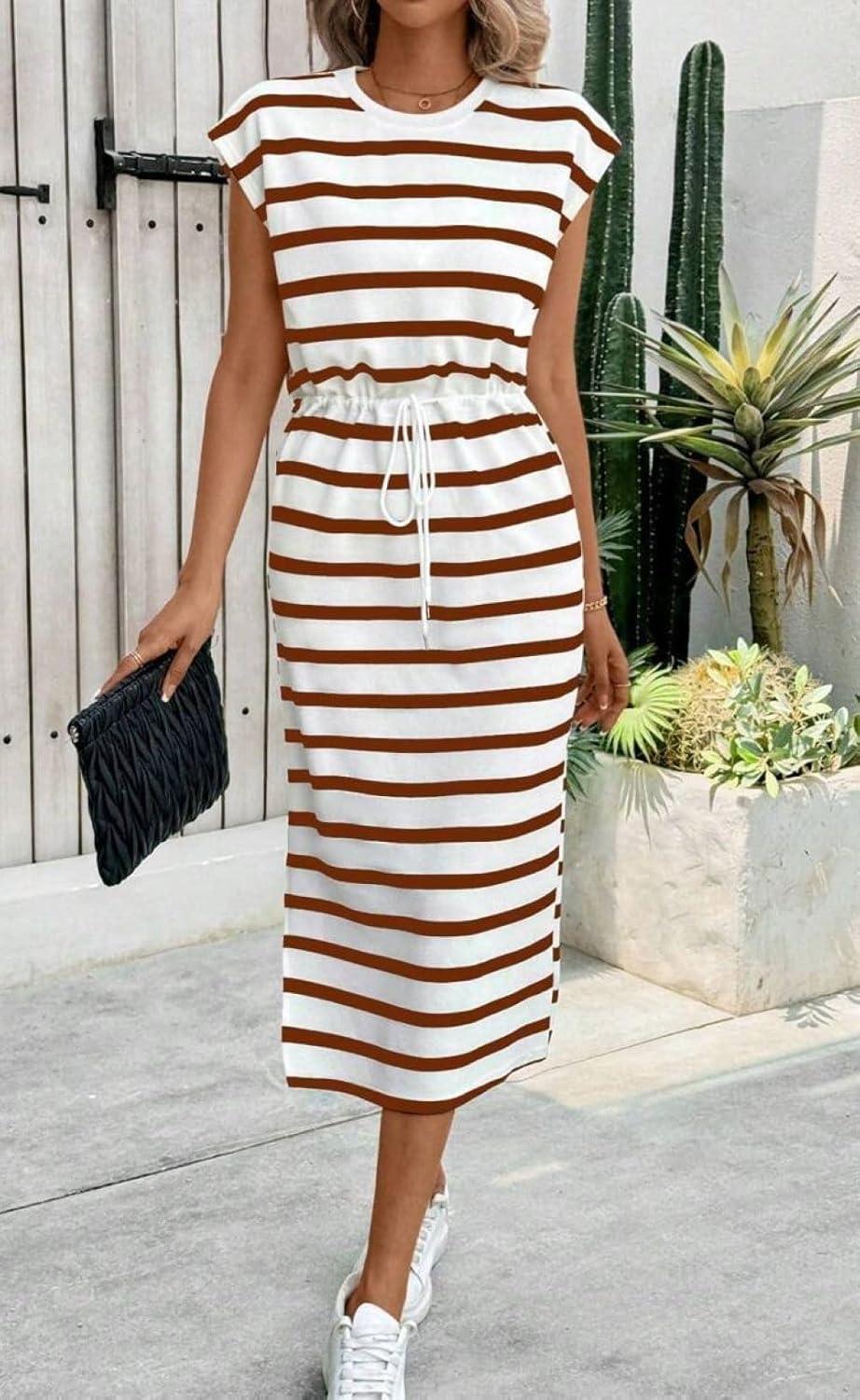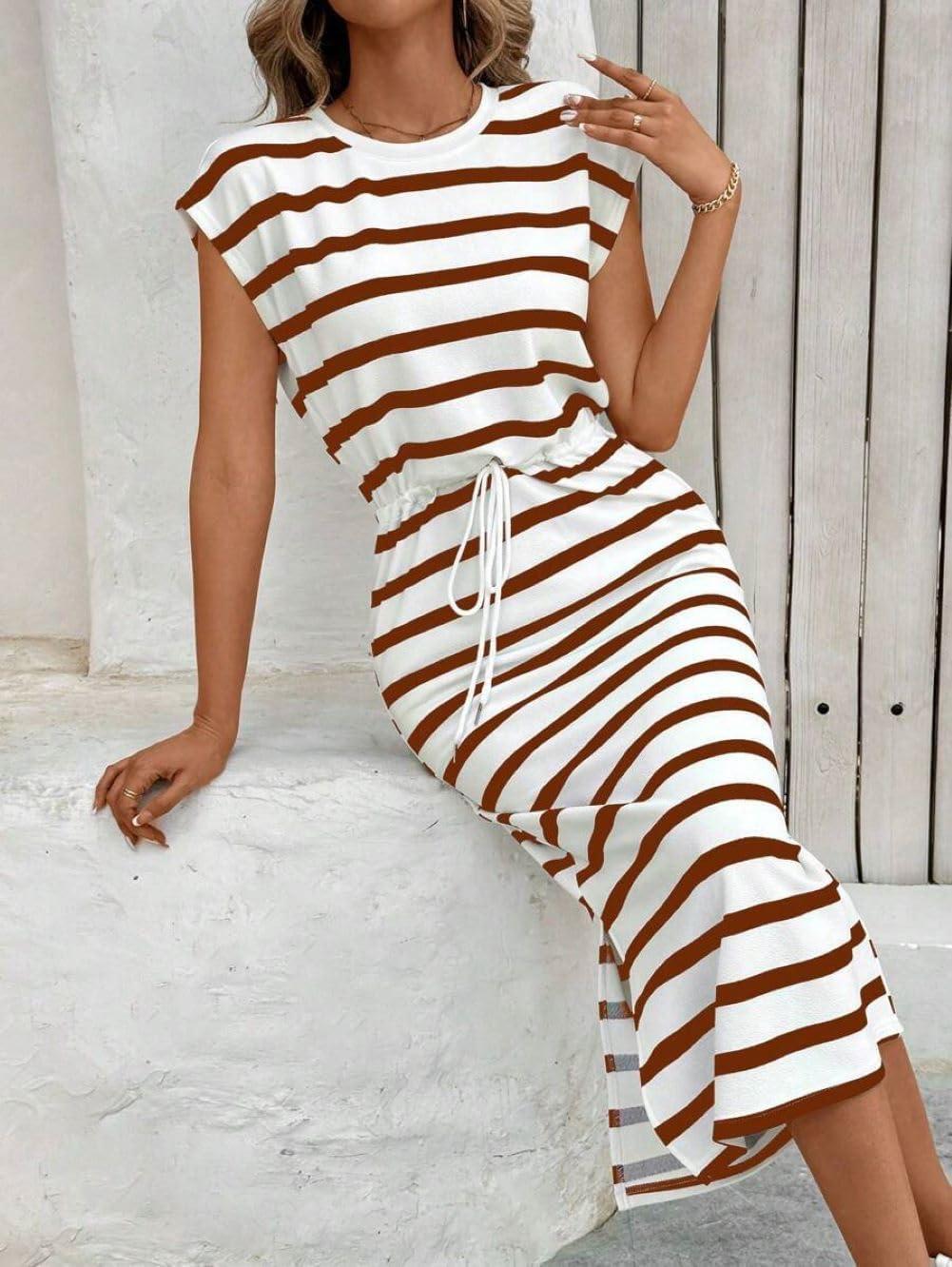 CHARTOU Women Summer Stripes Long Dress Cap Sleeve Adjustable Drawstring Waist Side Slit Midi Dress(Brown)