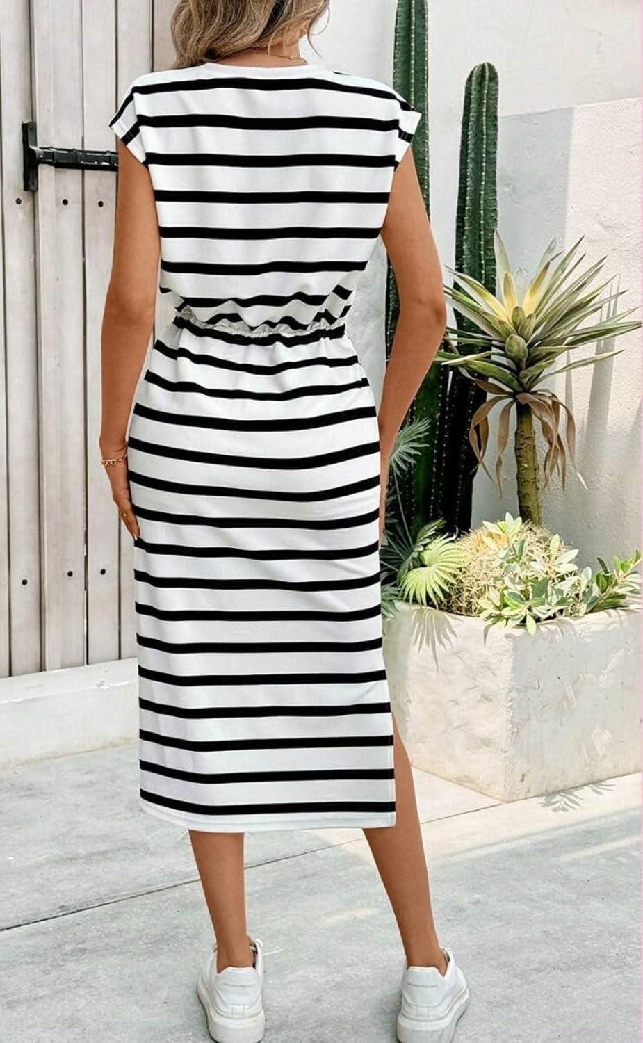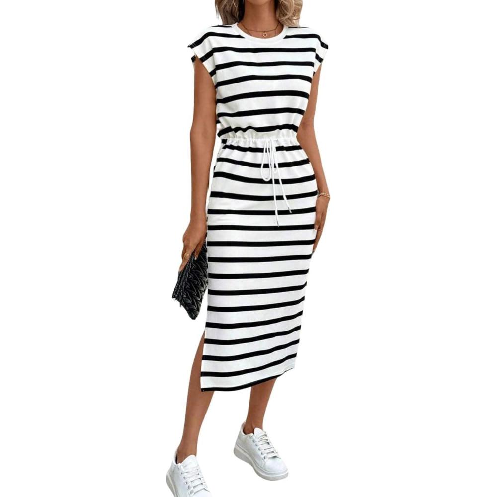 CHARTOU Women Stripes Long Dress/ Cap Sleeve Summer Vacation Dress/ Adjustable Drawstring Midi Dress/ High Waist A Line Dress/ Side Slit Summer Dress
