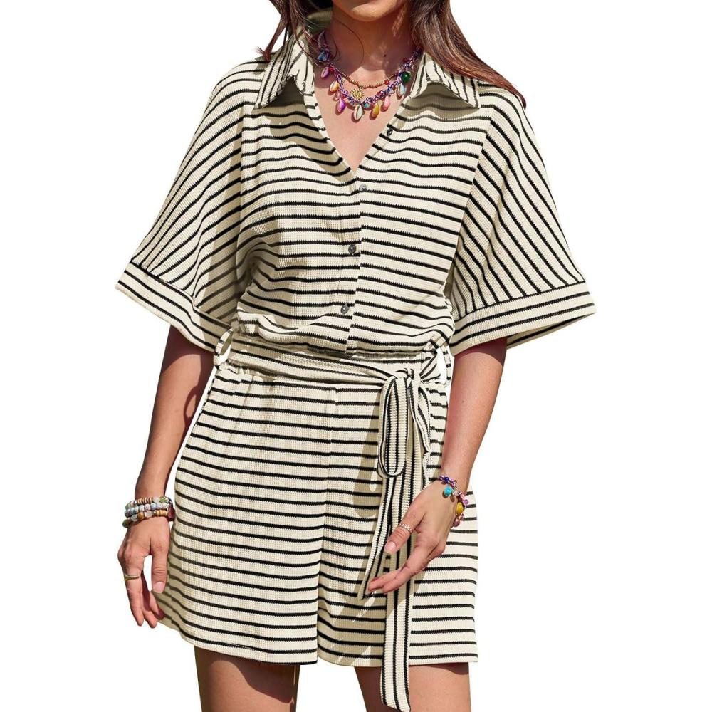 Be the first to review “CHARTOU Women Summer Stripes Romper Jumpsuit Short Sleeve Button Up Shirt Elastic Waist Overall with Pockets(White)”