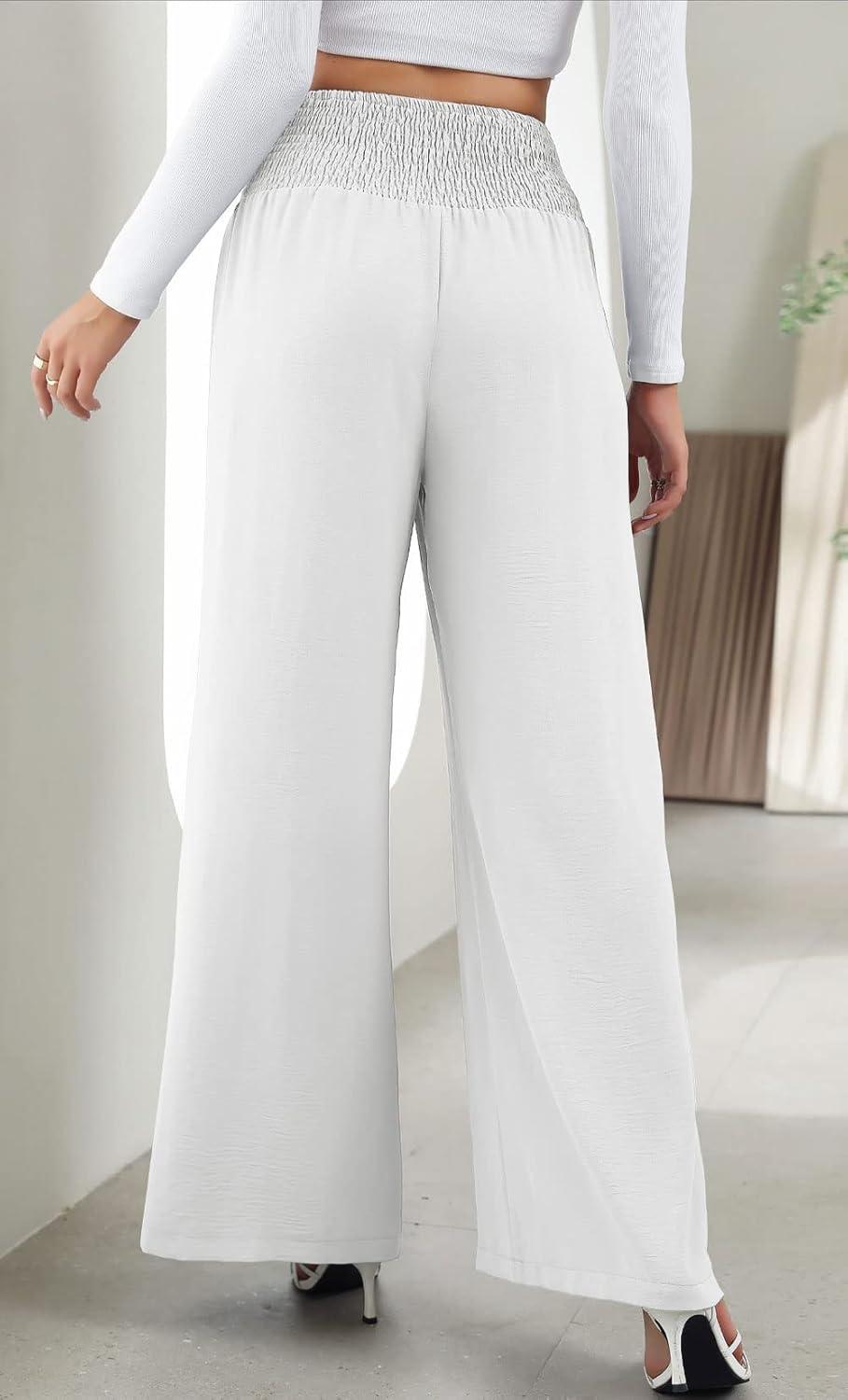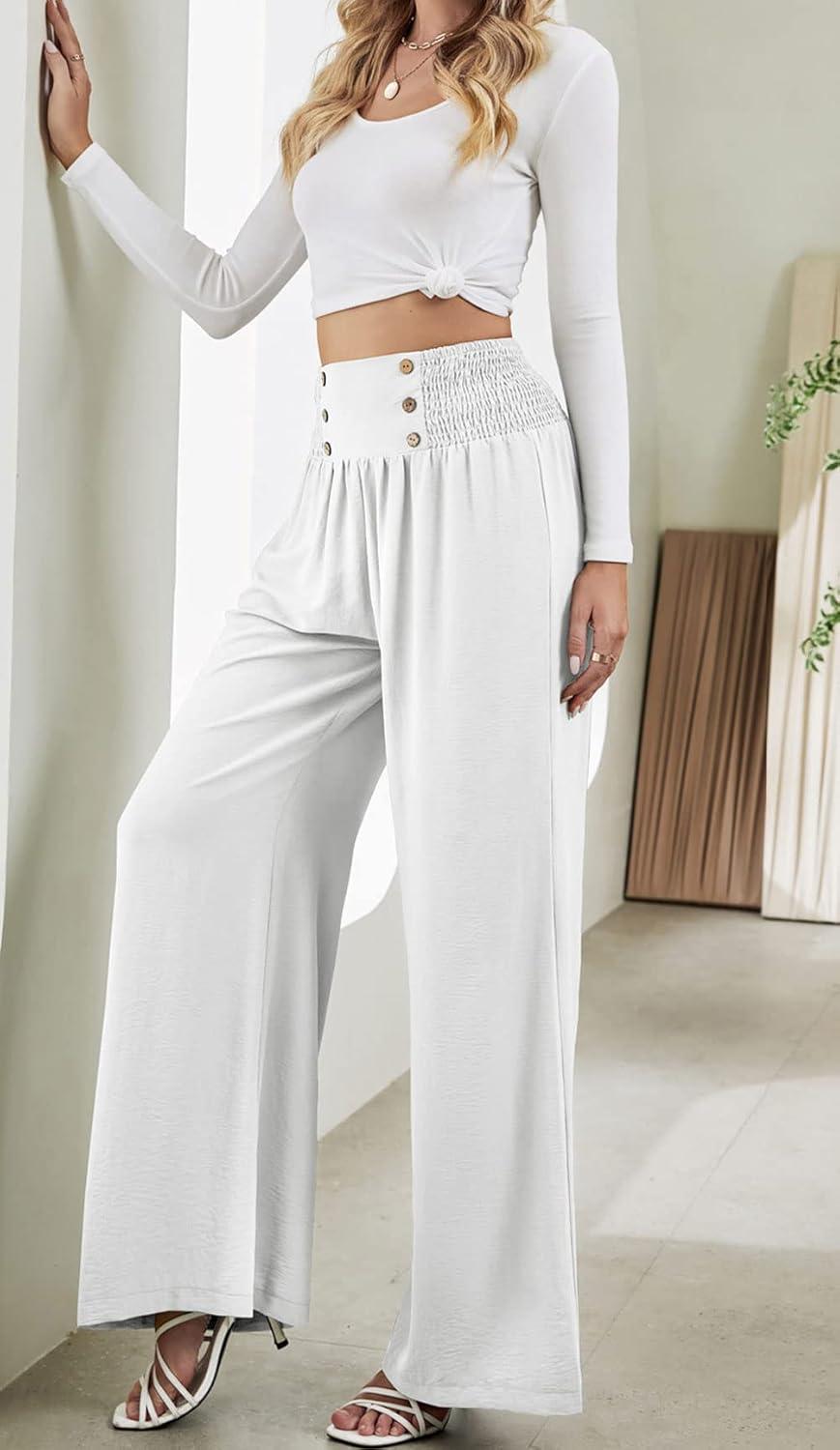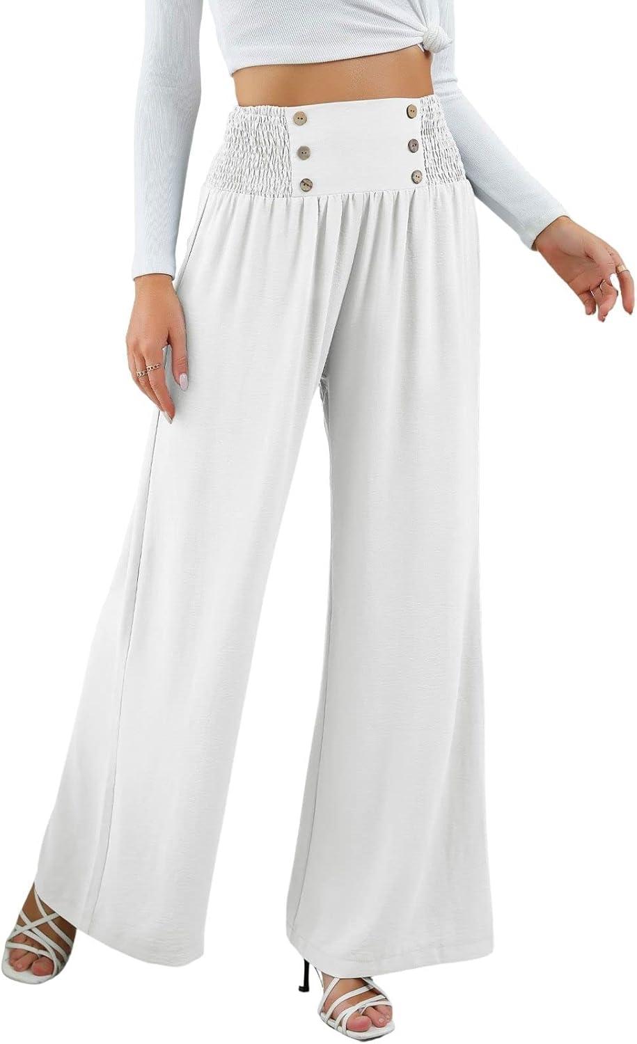 CHARTOU Women Summer Wide Leg Pants Palazzo Pants High Waist Beach Pants Flared Smocked Flowy Pants Dressy(White)