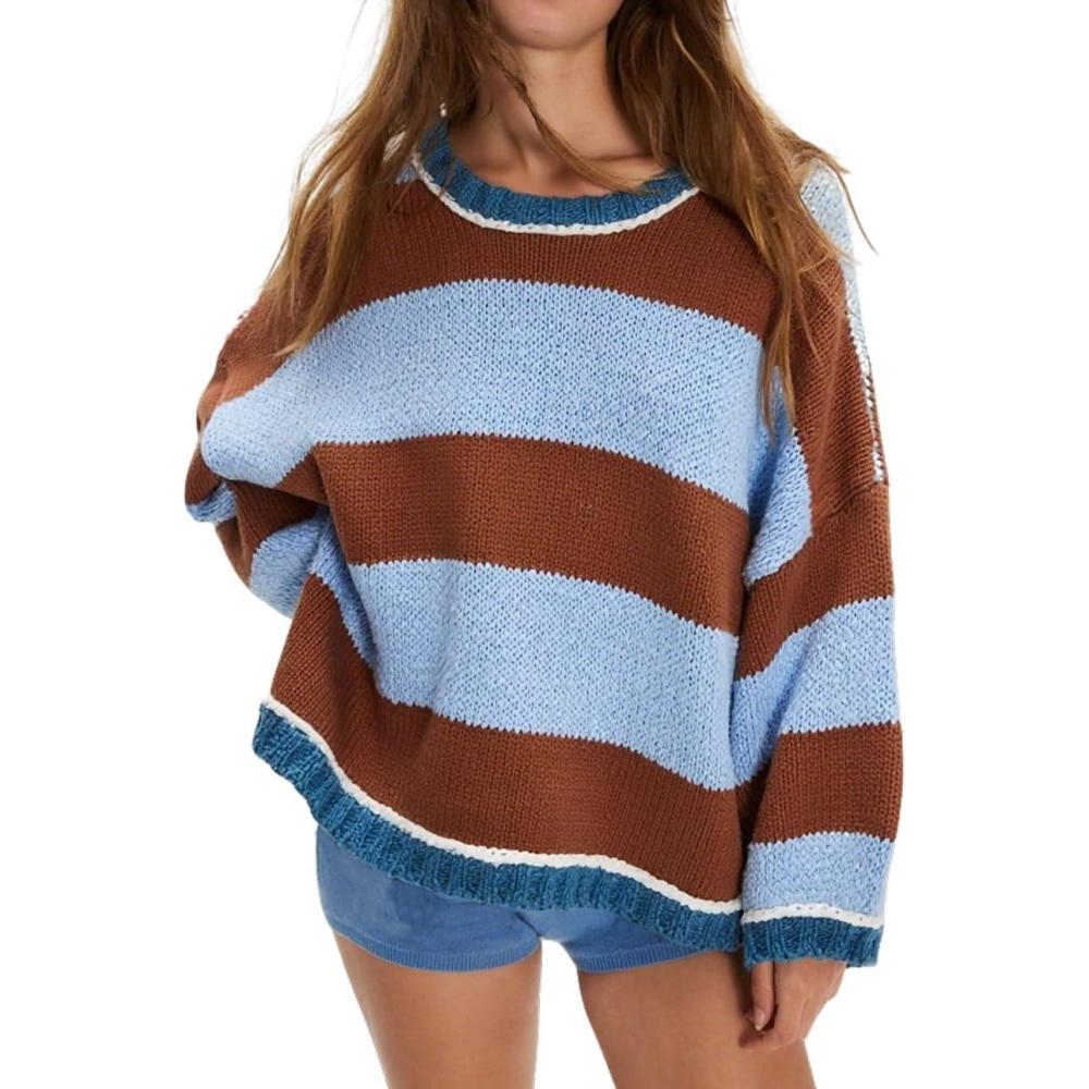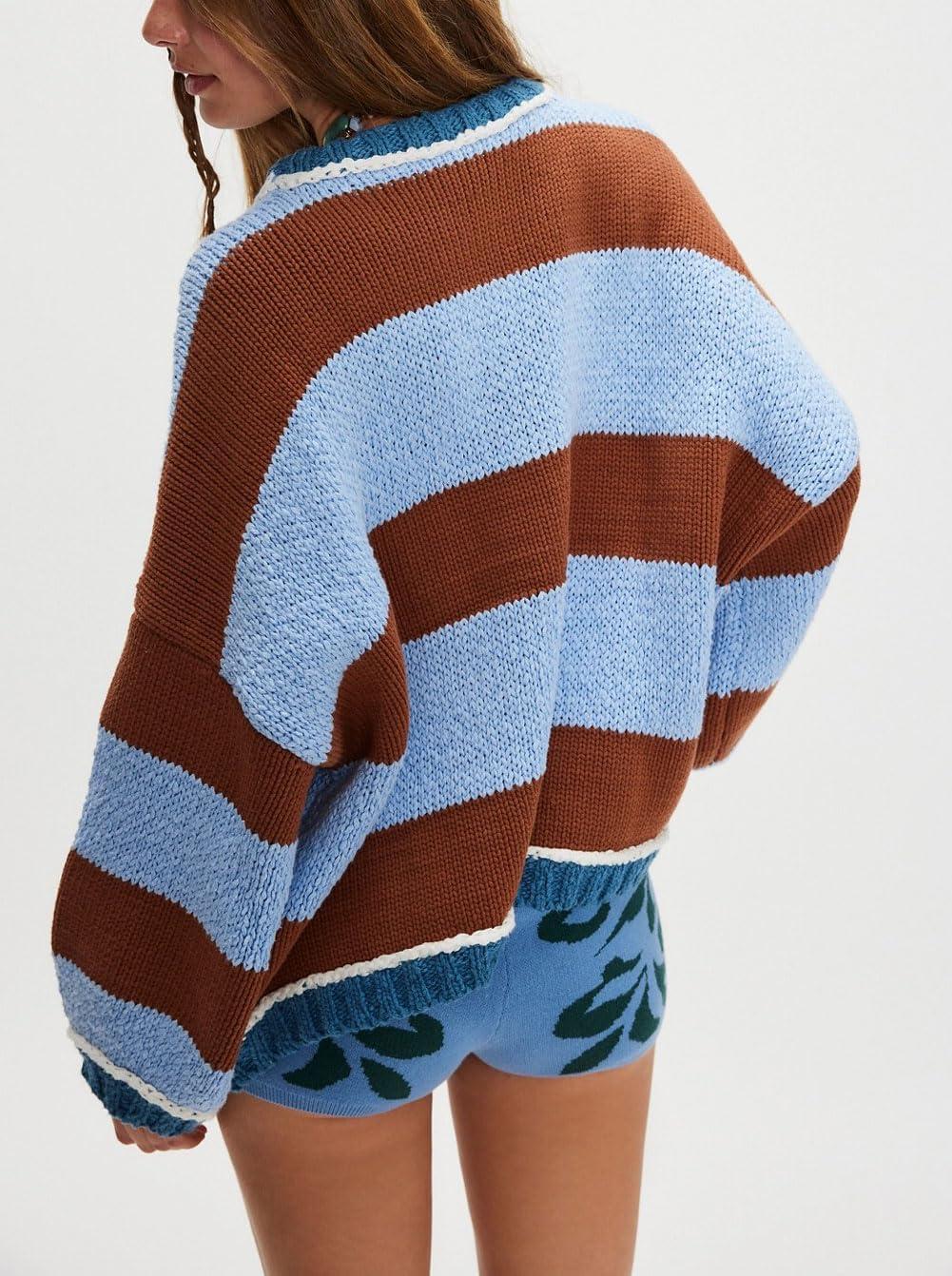 CHARTOU Women Sweater Fall 2025 Oversized Color Block Striped Long Sleeve Loose Pullover Sweater Knitted Tops(Blue)